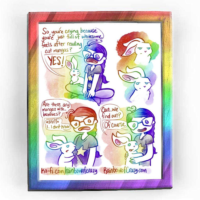 Rainbowofcrazy web comic. / Jo sits cross-legged on the ground. A white & black mini lop rabbit sits in Jo's lap. They both look at a tablet (it has a heart sticker on the back.) Jo, smiling: