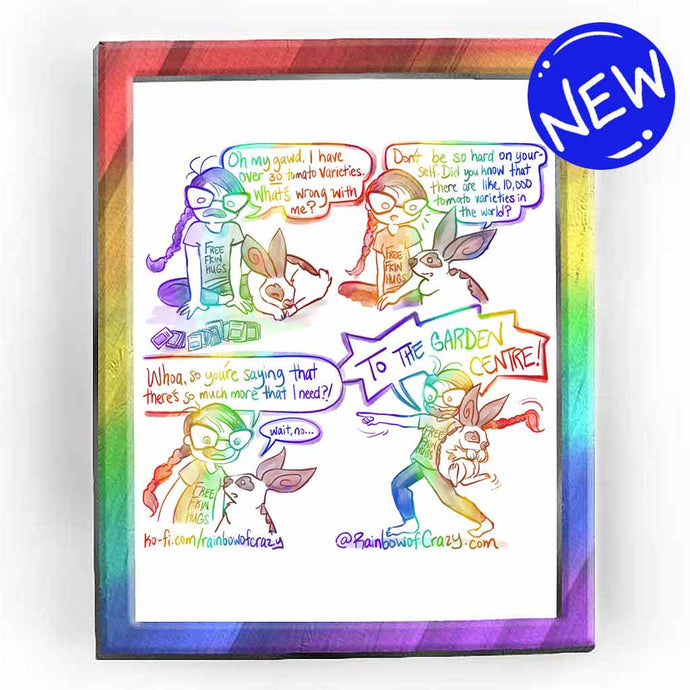 Rainbowofcrazy web comic. / [Rabbits have infiltrated my garden this year. They show no fear.] Brown/white rabbit walks on his hind feet, waving to Jo, who is watering a tomato plant, face blank. Rabbit: