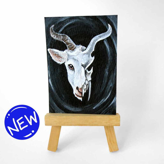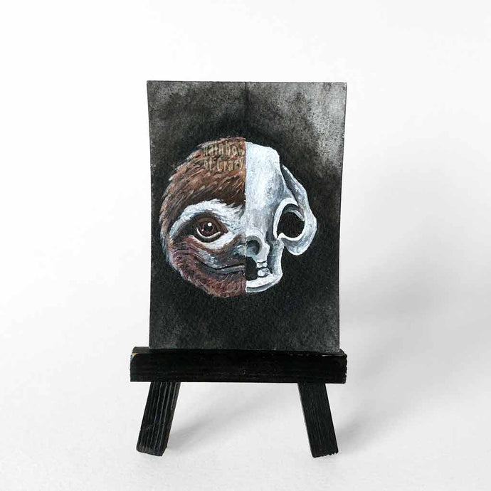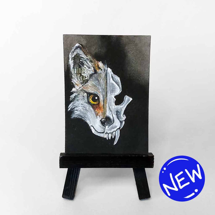 ACEO painting split into two halves: one side featuring a skunk skull, and the other a skunk's face