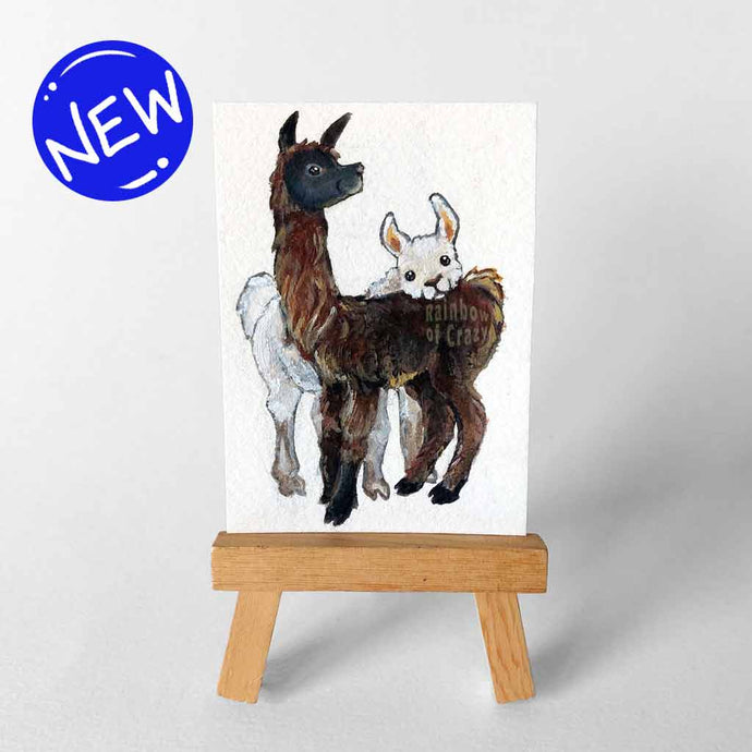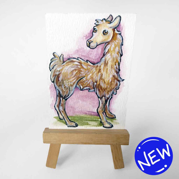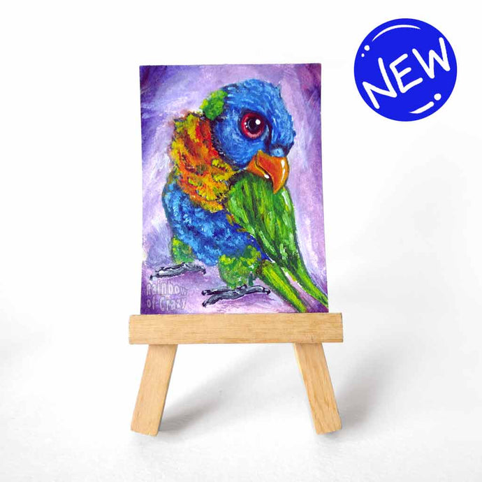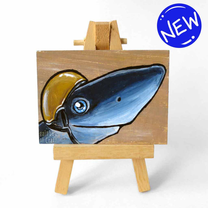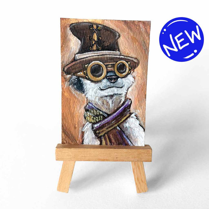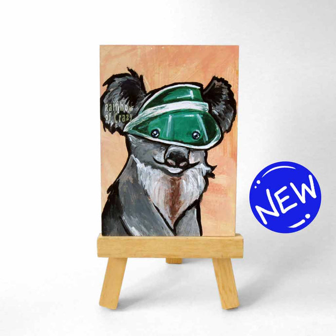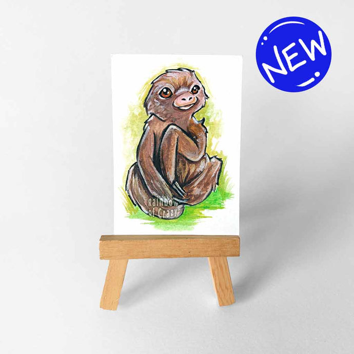 aceo sized painting on a wood easel, features a sloth wearing a navy blue flat cap hat, against a gray background