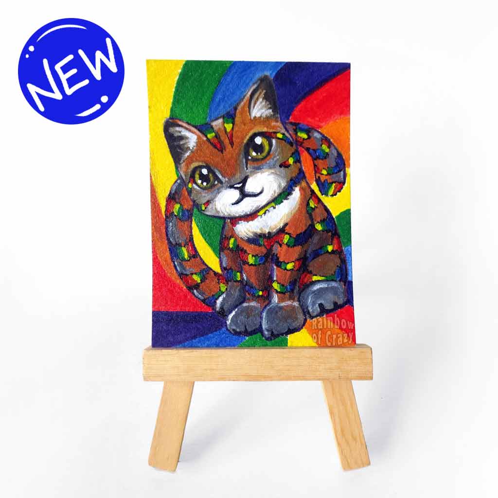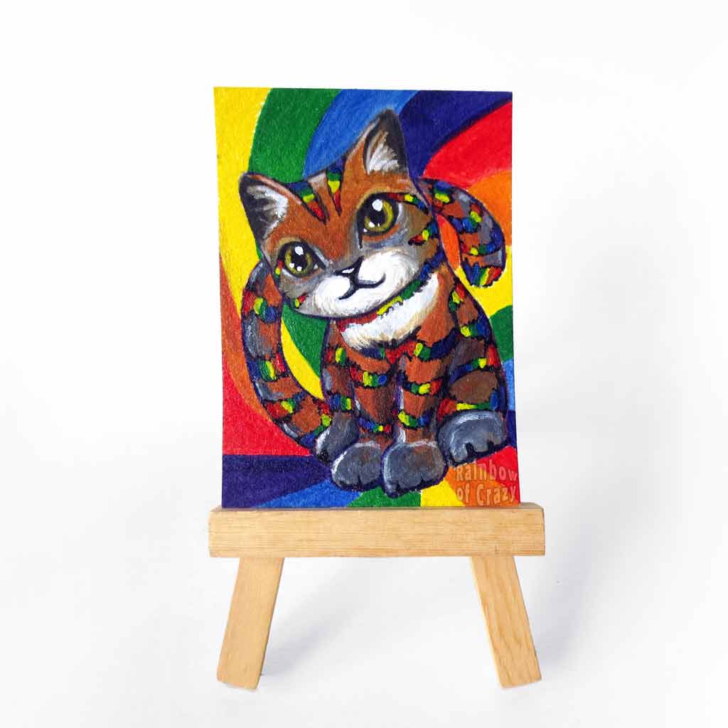 • Load image into Gallery viewer, an aceo sized painting of an andean cat with rainbow stripes, against a rainbow background