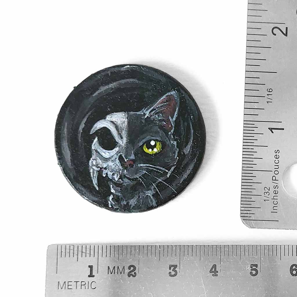 a circle shaped wood disc, hand painted with a split image: a black cat's face on the right side, and a cat skull on the left side. available as a keepsake or pendant necklace