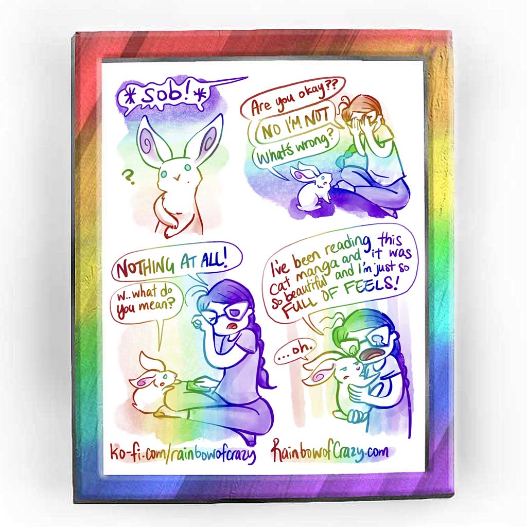 • Load image into Gallery viewer, Rainbowofcrazy web comic. / A sob comes from the right of the panel. White rabbit: "?" / Rabbit: "Are you okay??" Jo, crying into her hands: "NO I'M NOT." Rabbit: "What's wrong?" / Jo, wiping tears away: "NOTHING AT ALL!" Rabbit: "W.. what do you mean?" / Jo, holding the rabbit up  for a hug: "I've been reading this cat manga and it was so beautiful and I'm just so FULL OF FEELS!" Rabbit, umimpressed: "... oh." / Rainbowofcrazy.com