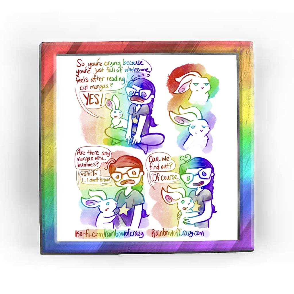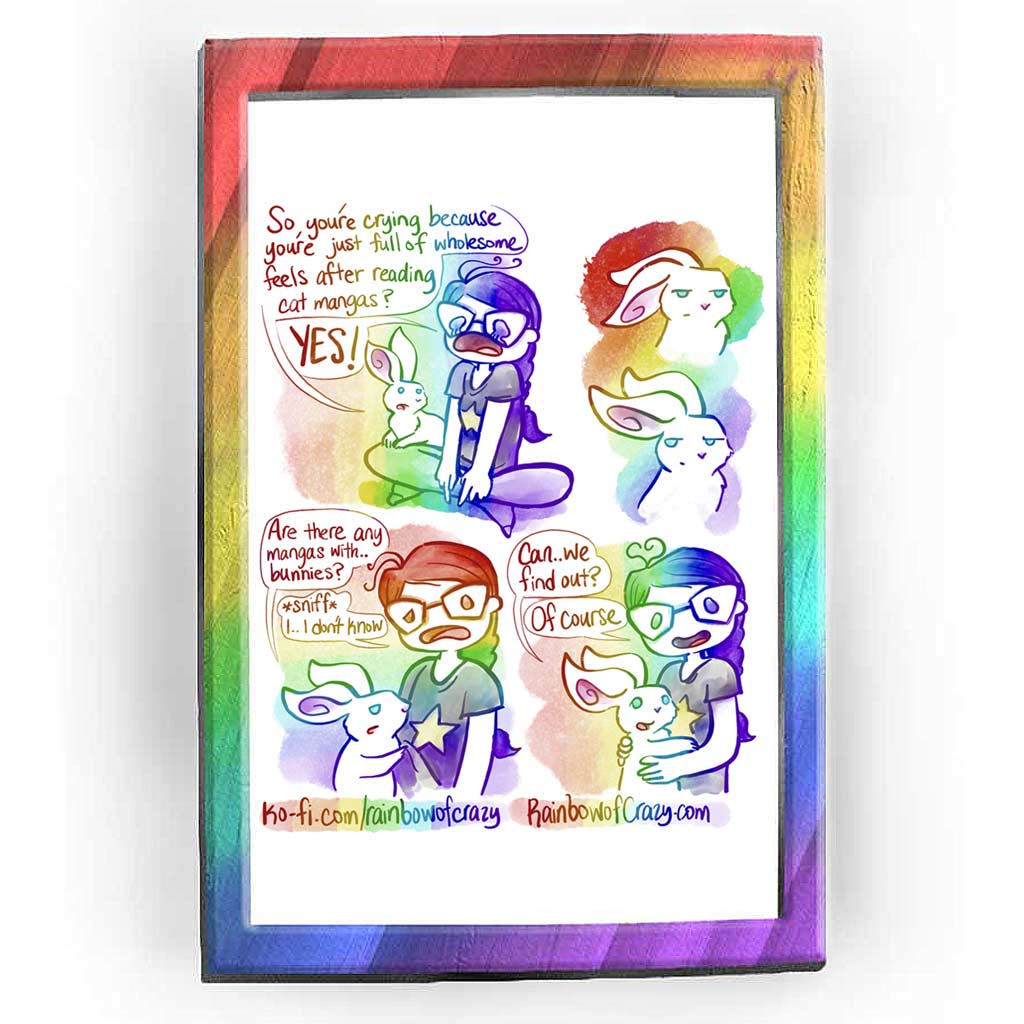 Full alt text: Rainbowofcrazy web comic. / White rabbit, sitting on Jo's leg: "So you're crying because you're just full of wholesome feels after reading cat mangas?" Jo, weeping: "YES!" / Close up of the rabbit, looking unimpressed.  / Rabbit looks away, pondering. / Rabbit, still looking unimpressed: "Are there any mangas with.. bunnies?" Jo: "*sniff* I.. I don't know." / Rabbit, smiling slightly: "Can.. we find out?" Jo, smiling: "Of course." / Rainbowofcrazy.com