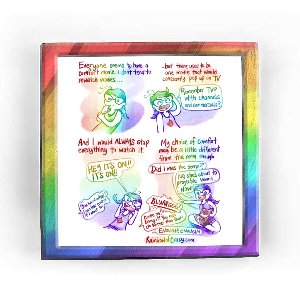 Full alt text: Rainbowofcrazy web comic: "Pitch Perfect Comfort." / Jo looking deep in thought. [Everyone seems to have a comfort movie. I don't tend to rewatch movies...] / [.. but there used to be one movie that would constantly pop up on TV.] Jo: "Remember TV? With channels and commercials?" / [And I would ALWAYS stop everything to watch it.] Jo leans back slightly, hands around her mouth. Jo: "HEY IT'S ON!! IT'S ON!!" An unidentified voice, source coming from off panel: "You know what? I can lose control if I want to!" / [My choice of comfort maybe a little different from the norm though.] A ragdoll cat appears in Jo's lap, back feet up in the air in total comfort, with a big smile. Cat: "Did I miss the scene?!" Jo: "No, she's about to projectile vomit... NOW!" TV voice 1: "BLURRGGG!" TV voice 2: "Come on! Bring it! You can do better than that!" TV voice 3: "ENOUGH! ENOUGH!!" / Rainbowofcrazy.com