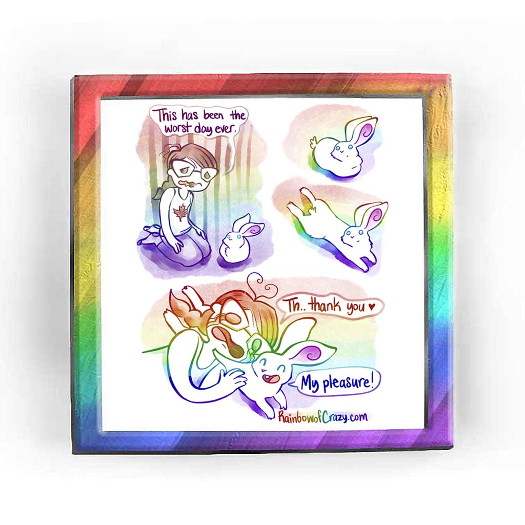 • Load image into Gallery viewer, Full alt text: Rainbowofcrazy web comic: To the Rescue. / Jo, kneeling on the ground, next to a white rabbit. Jo, looking miserable: "This has been the worst day ever." / The rabbit, in proper rabbit loaf form, looks up at Jo. / The rabbit now stretches out into a sploot, looking up at Jo, small smile on her face. / Jo, head resting on the rabbit's back, hand on the rabbit, tears in her eyes. Jo: "Th.. thank you ❤️". Rabbit, with a big smile: "My pleasure!" / Rainbowofcrazy.com