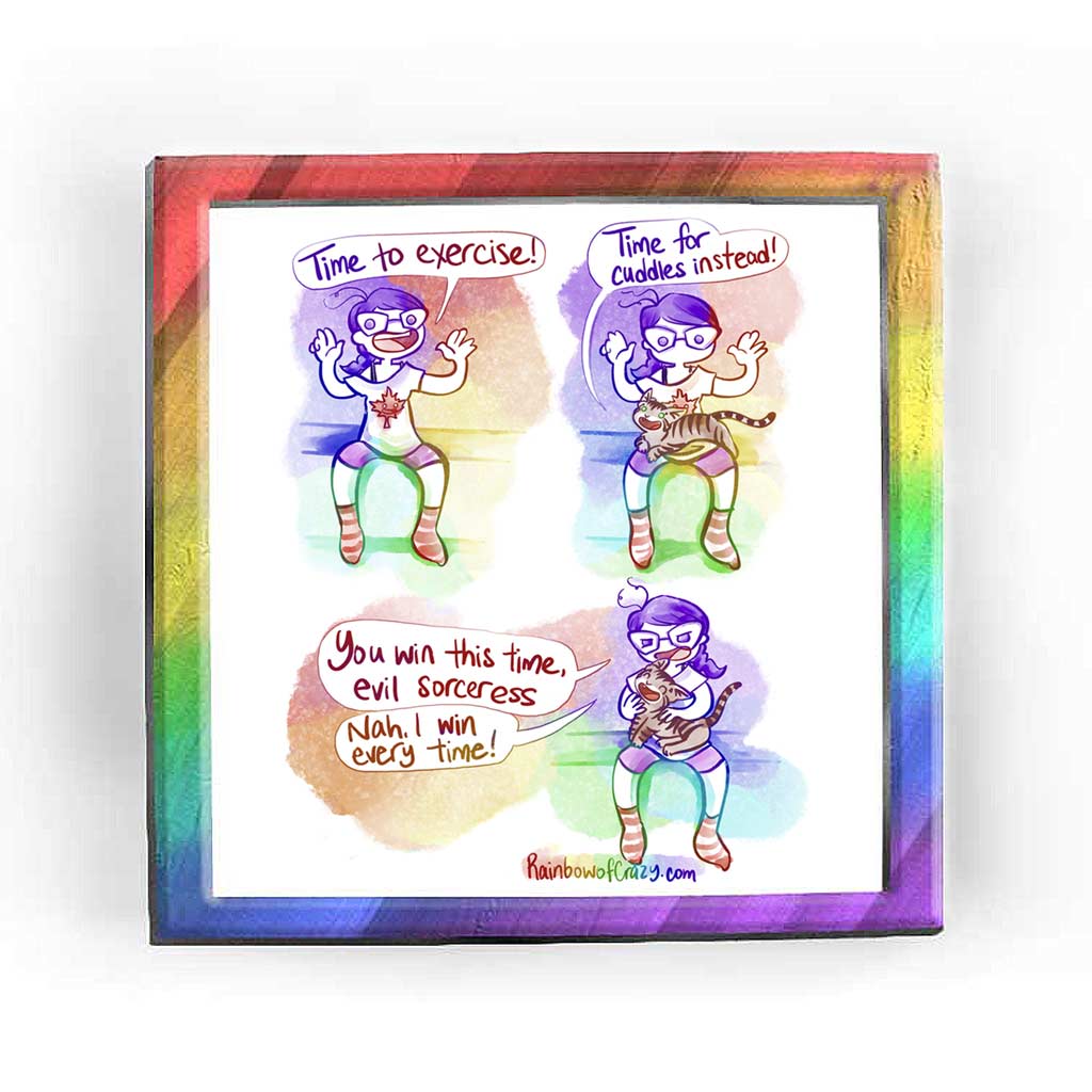 Rainbowofcrazy web comic: Cuddles. / Jo sitting on the edge of the bed, hands up, big smile. "Time to exercise!" / Jo looks down to see that a tabby cat has magically appeared on her lap. Cat: "Time for cuddles instead!" / Jo, scowling, petting the cat: "You win this time, evil sorceress." Cat, all smiles: "Nah, I win every time!" / Rainbowofcrazy.com