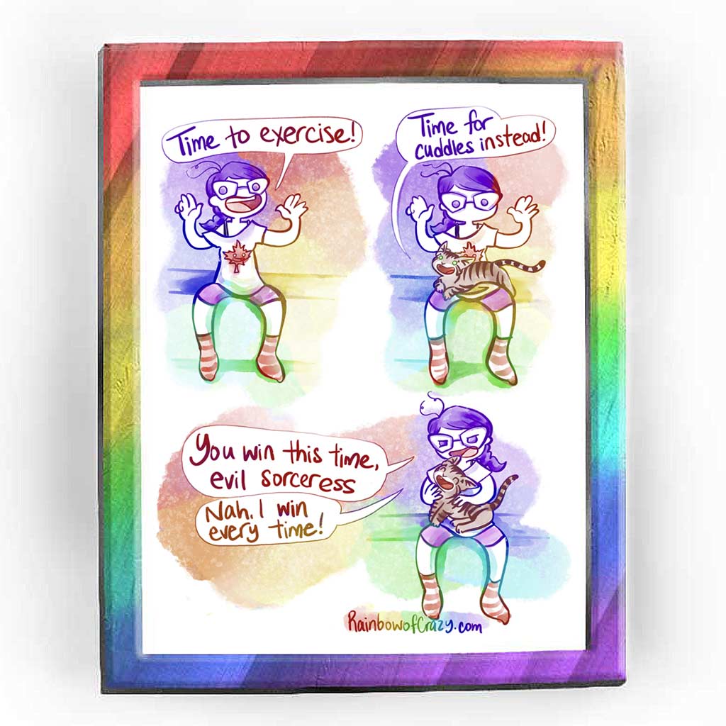 • Load image into Gallery viewer, Rainbowofcrazy web comic: Cuddles. / Jo sitting on the edge of the bed, hands up, big smile. "Time to exercise!" / Jo looks down to see that a tabby cat has magically appeared on her lap. Cat: "Time for cuddles instead!" / Jo, scowling, petting the cat: "You win this time, evil sorceress." Cat, all smiles: "Nah, I win every time!" / Rainbowofcrazy.com