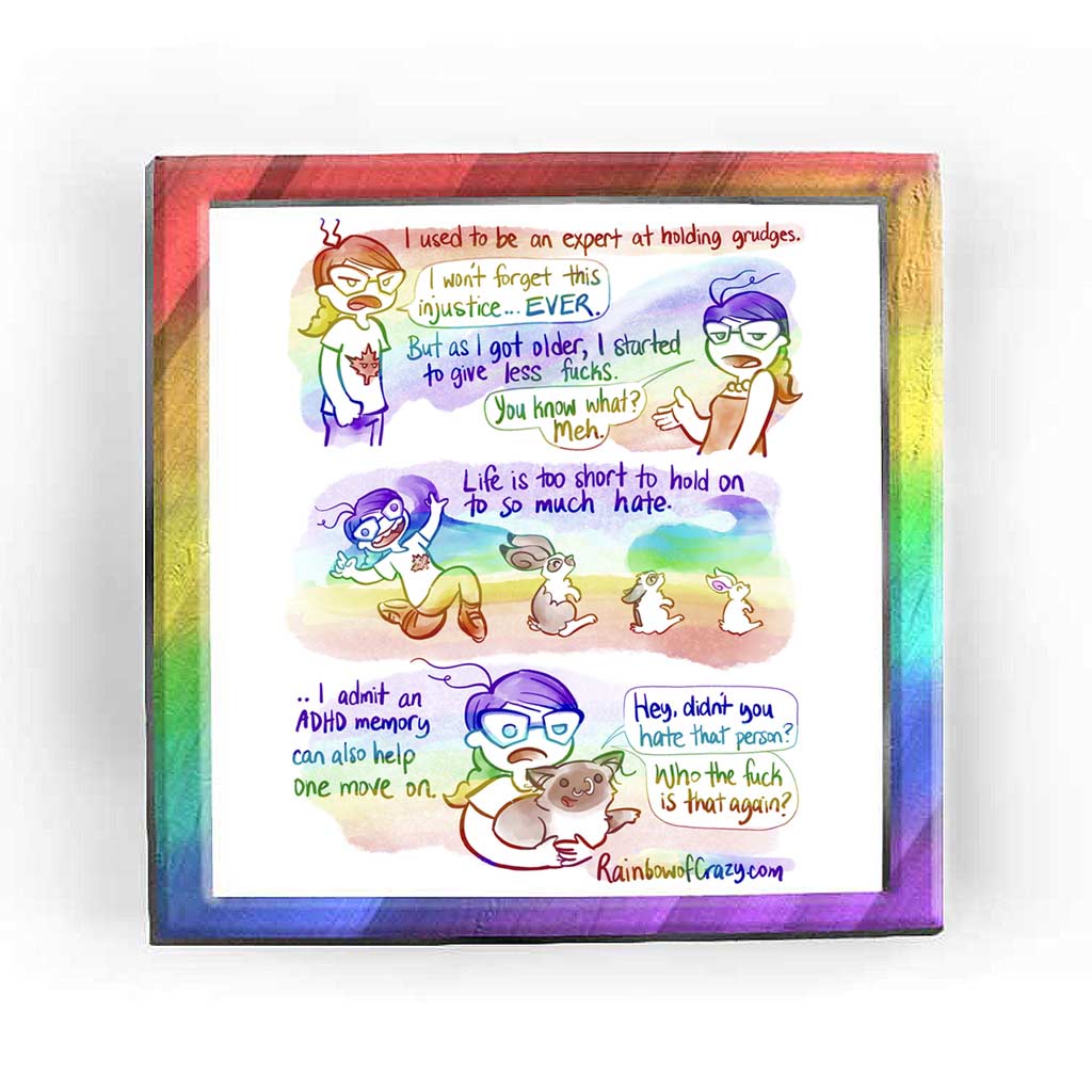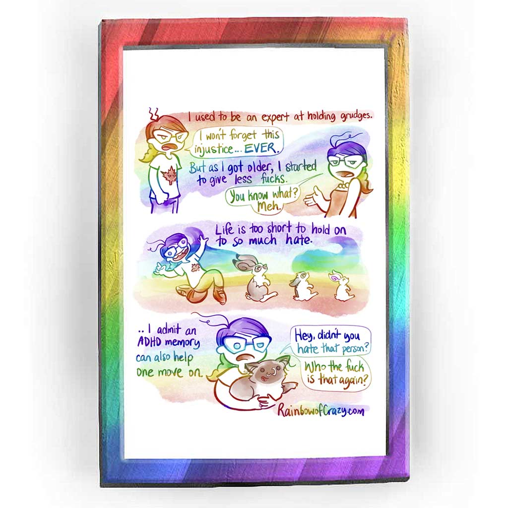 Full alt text: Rainbowofcrazy web comic: Grudges. / [I used to be an expert at holding grudges.] Jo, looking angry, hand in a fist: "I won't forget this injustice... EVER." / [But as I got older, I started to give less fucks.] Jo, in an orange strapless dress and pearls, one hand raised, palm up: "You know what? Meh." (an ode to Lisa Simpson) / [Life is too short to hold on to so much hate.] Jo is skipping along, a very derpy expression is on her face. Three bunnies skip along in front of her, all up them with the heads tilted up. (the scene an ode to Homer Simpson in the Land of Chocolate.) / [.. I admit an ADHD memory can also help one move on.] Jo holds a ragdoll cat in her arms. Cat points to something off screen: "Hey, didn't you hate that person?" Jo: "Who the fuck is that again?" / Rainbowofcrazy.com