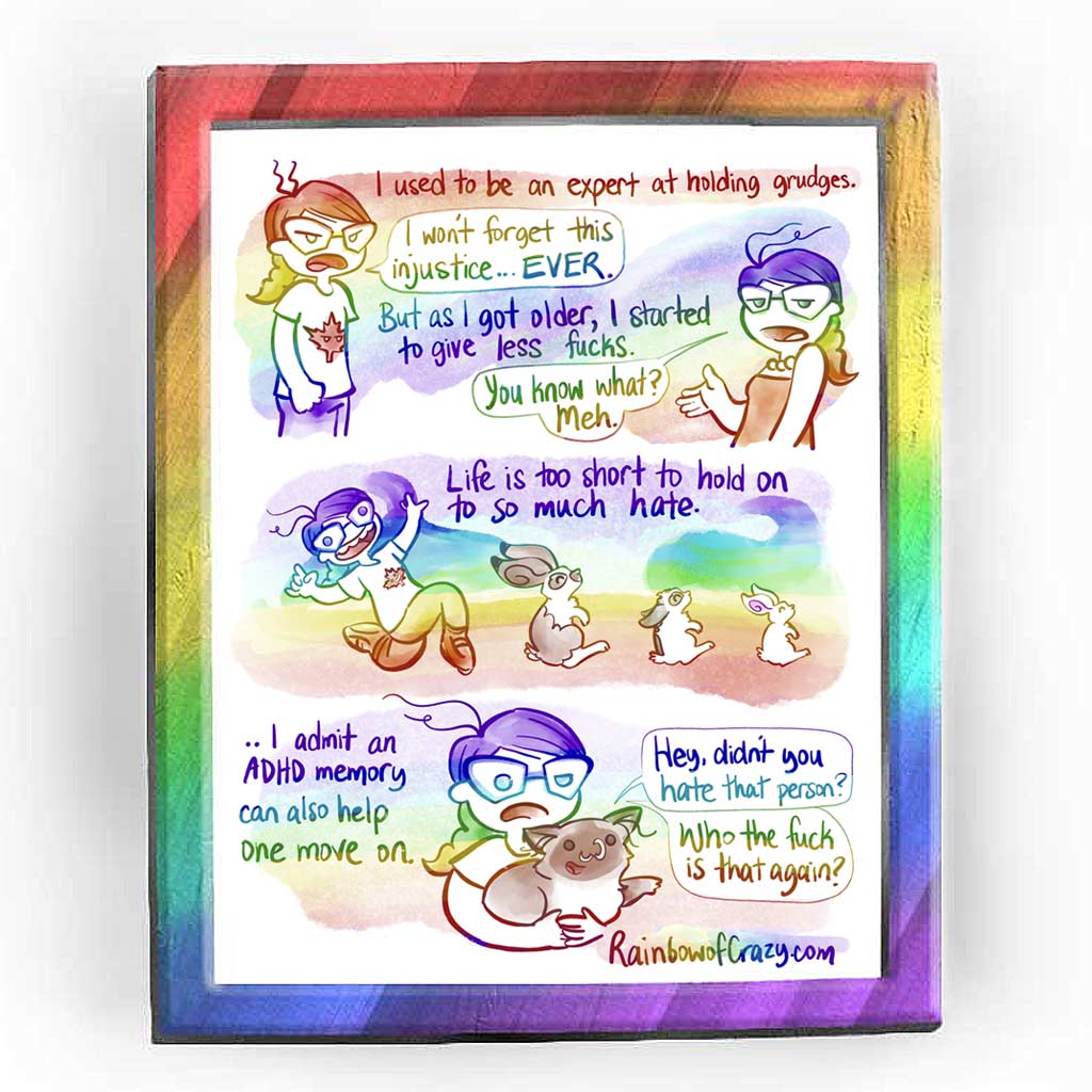 Rainbowofcrazy web comic: Grudges. / [I used to be an expert at holding grudges.] Jo, looking angry, hand in a fist: "I won't forget this injustice... EVER." / [But as I got older, I started to give less fucks.] Jo, in an orange strapless dress and pearls, one hand raised, palm up: "You know what? Meh." (an ode to Lisa Simpson) / [Life is too short to hold on to so much hate.] Jo is skipping along, a very derpy expression is on her face. Three bunnies skip along in front of her, all up them with the heads t