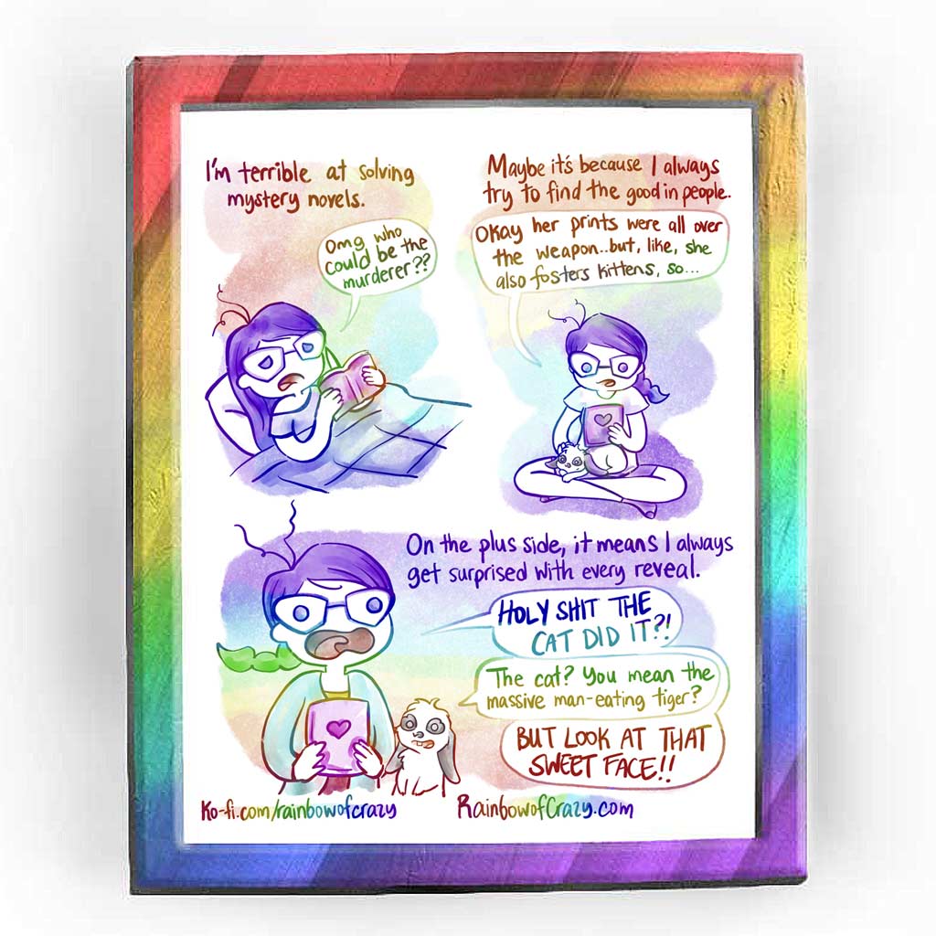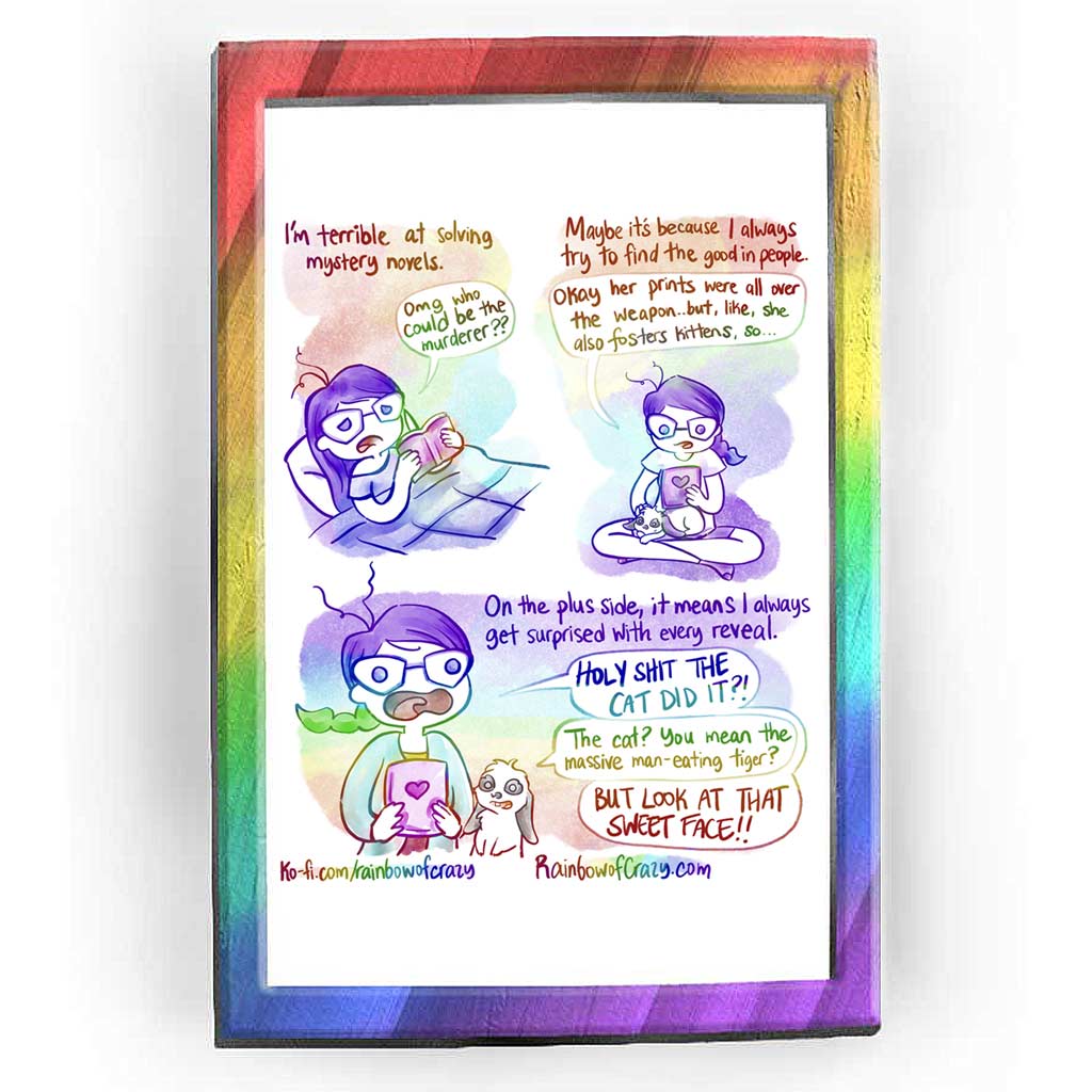 • Load image into Gallery viewer, Rainbowofcrazy web comic: Mystery Books. / [I'm terrible at solving mystery novels.] Jo is in bed, reading a book. She frowns. Jo: "Omg who could be the murderer?" / [Maybe it's because I always try to find the good in people.] Jo sits cross-legged. She holds a tablet. A white and black mini lop rabbit is curled up in Jo's lap. Jo: "Okay her prints were all over the weapon.. but, like, she also fosters kittens, so..." / [On the plus side, it means I always get surprised with every reveal.] Jo, holding a tab