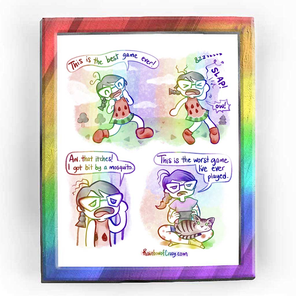 • Load image into Gallery viewer, Rainbowofcrazy web comic: Best Game. / Jo's character in Animal Crossing, wearing a watermelon dress and red boots. She is frolicking with joy. Jo: "This is the best game ever!" / Jo slaps herself in the face. "SLAP!" A bug can be seen flying away with a "Bzzzz." Jo: "OW!" / Close-up of Jo rubbing at her face, frowning. Jo: "Aw, that itches! I got bit by a mosquito.." / Cut to IRL Jo sitting cross-legged on the ground, a smiling tabby cat is in her lap. Jo holds a Nintendo Switch. IRL Jo is also covered in