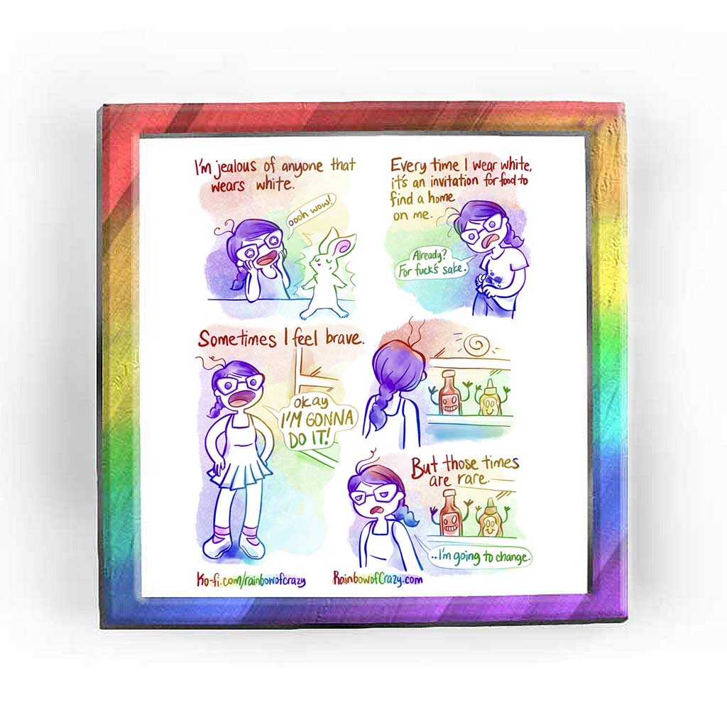• Load image into Gallery viewer, Rainbowofcrazy web comic: White Clothes. [I'm jealous of anyone that wears white.] Jo looks on in awe of a white rabbit that is standing up, striking a pose, arms slightly stretched out, eyes closed and smiling. Jo, hands on her face, has stars in her eyes in admiration of the rabbit. Jo: "oooh wow!" / [Every time I wear white, it's an invitation for food to find a home on me.] Jo looking down at her white t-shirt, full of stains. Jo: "Already? For fuck's sake." / [Sometimes I feel brave.] Jo wears a white