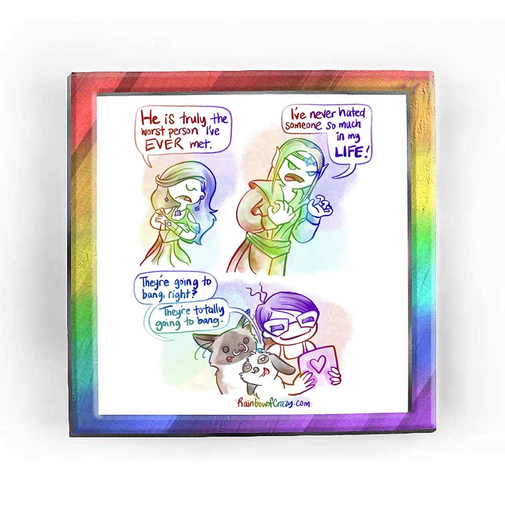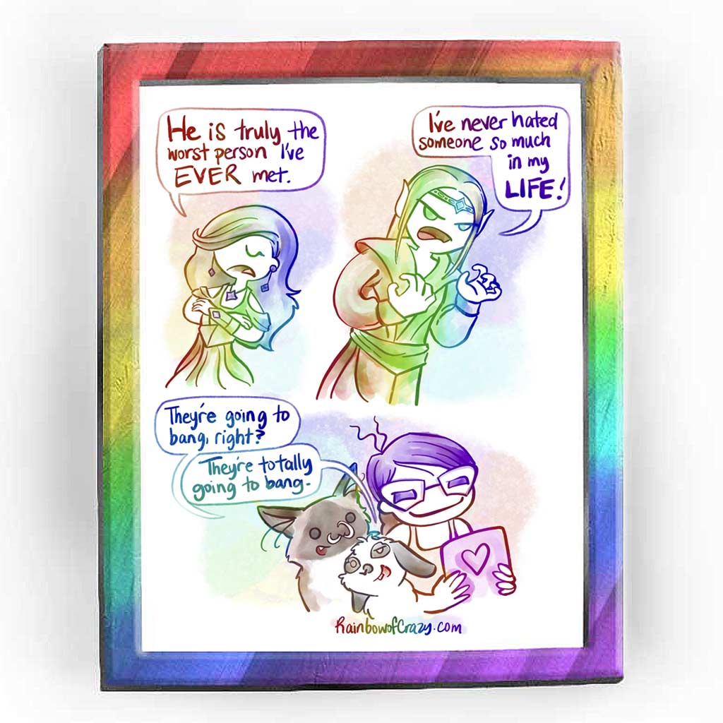 • Load image into Gallery viewer, Rainbowofcrazy web comic: Enemies. / A person wears a long flowing dress, has long hair flowing over one eye. Arms folded, they look very unimpressed. "He is truly the worst person I've EVER met. / A taller figure - an elf with pointed ears, long hair, a jewelled tiara across the forehead, in elf-ish clothes (note from artist: I don't know elf clothes, y'all, I tried.) The elf looks enraged. "I've never hated someone so much in my LIFE!" / The comic cuts to Jo, holding a tablet that has a heart on the back.