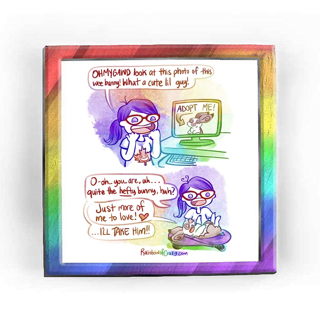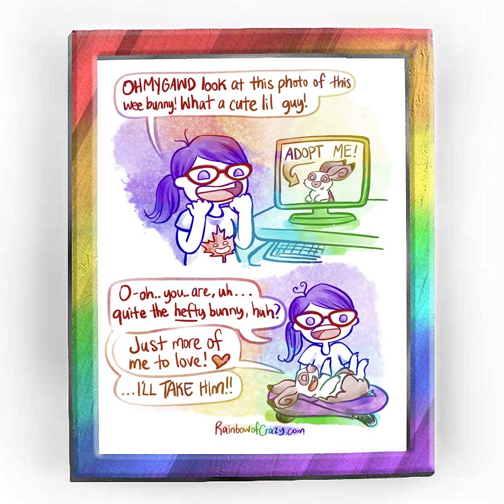 Full alt text: Rainbowofcrazy web comic: "Adopt Me." / Jo looks at the computer screen, which displays a photo of a smiling brown & white English Spot rabbit. The words "ADOPT ME!" appear at the top of the screen, with an arrow pointing to the rabbit. Jo, wearing red glasses, hair in a ponytail, her hands in fists, held near her face, beams. "OH MY GAWD look at this photo of this wee bunny!! What a cute lil guy!" / Comic cuts to Jo sitting cross-legged on the ground. She looks down at the very same English Spot rabbit that's now in her lap.. on his back, the very large rabbit takes up the entirety of Jo's available lap space. Jo: "O-oh.. you.. are, uh... quite the hefty bunny, huh?" Rabbit: "Just more of me to love! ❤️" Jo: "... I'LL TAKE HIM!!" / Rainbowofcrazy.com