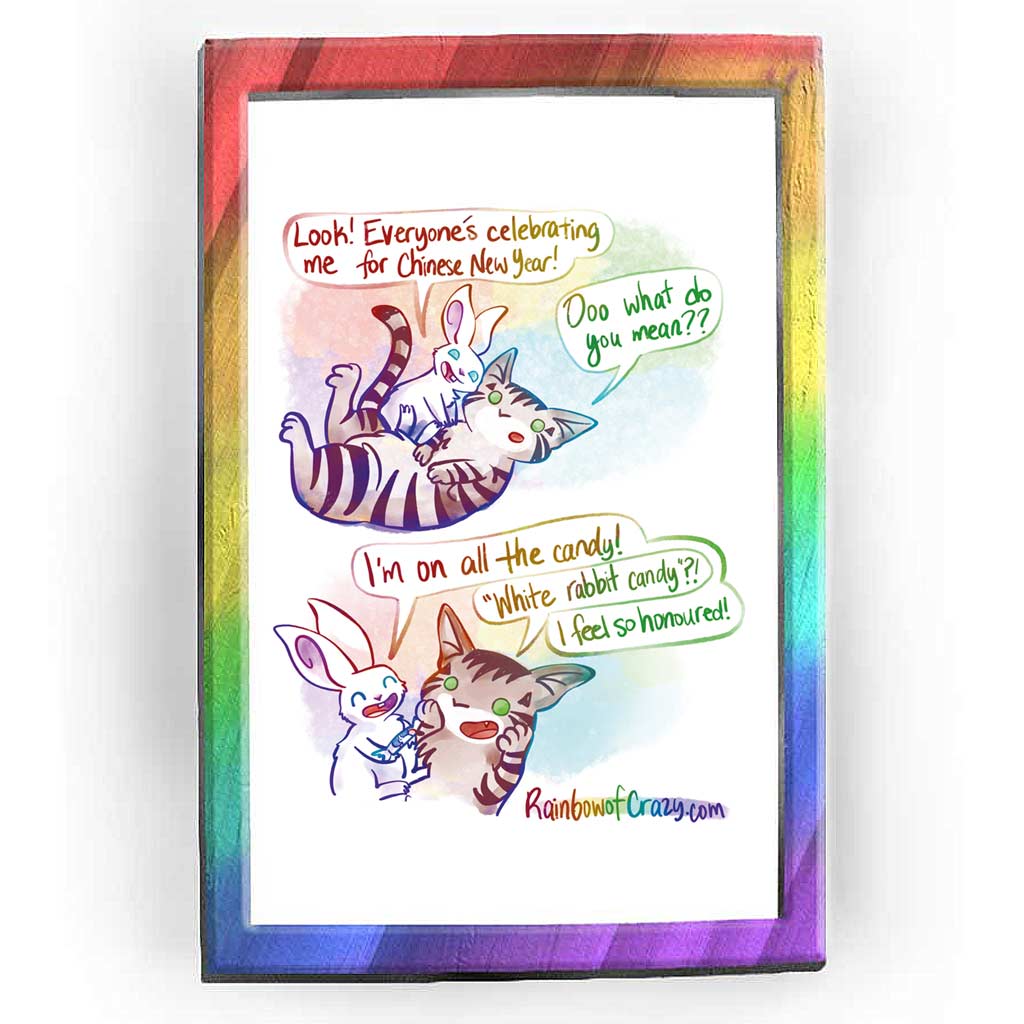 • Load image into Gallery viewer, Rainbowofcrazy comics: "Chinese New Year," A tabby cat lies on her back, with a white rabbit sitting on top of the cat's belly. The white rabbit leans in towards the cat's face. The rabbit, smiling: "Look! Everyone's celebrating me for Chinese New Year!" Cat: "Ooo what do you mean??" / Rabbit, holding up a piece of wrapped candy: "I'm on all the candy!" Cat: "'White rabbit candy'?!" Rabbit, all smiles: "I feel so honoured!" / Rainbowofcrazy.com