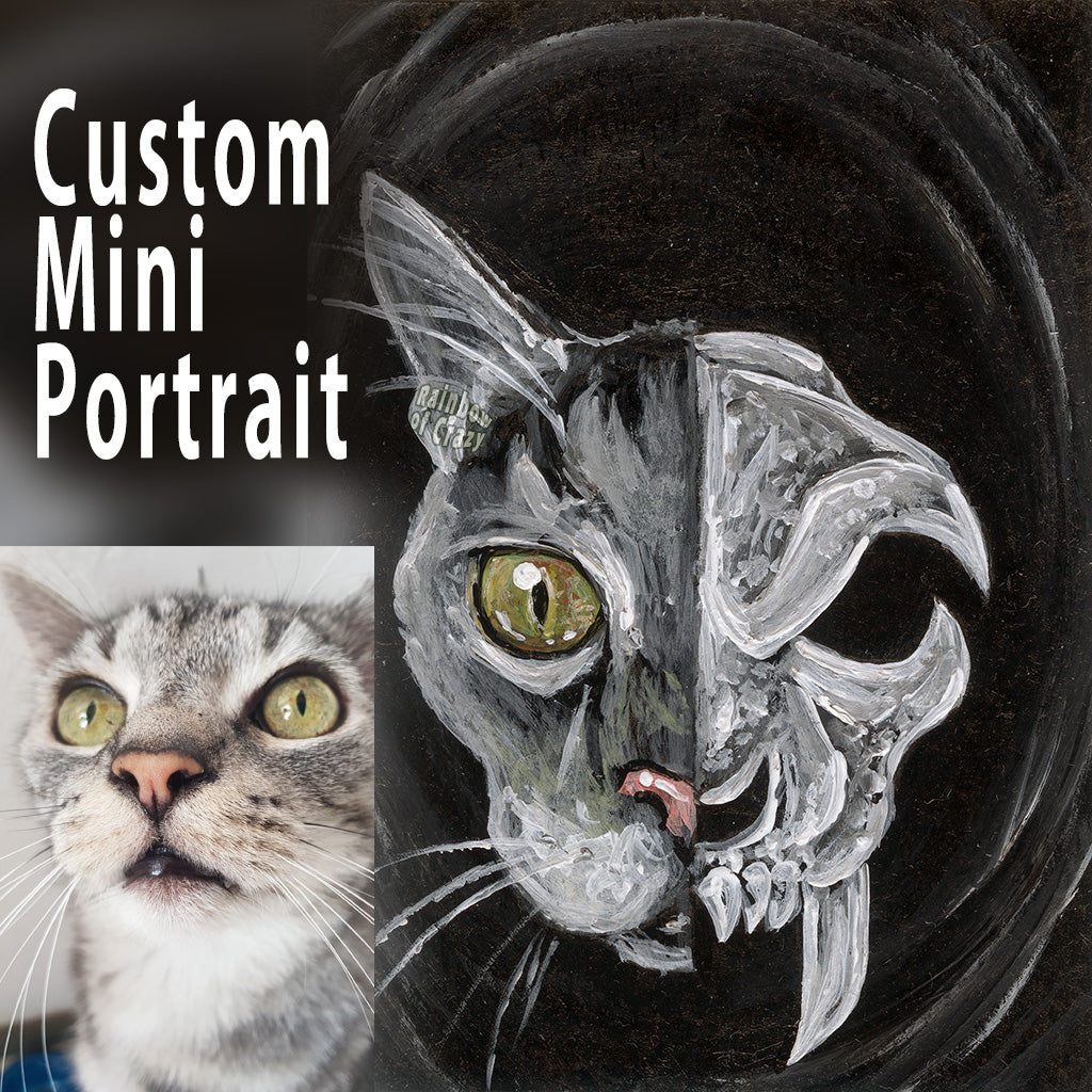 This ACEO sized pet portrait is perfect for a little gothic style to your home. Your pet's face is painted as half pet, half skull. A little spooky, a little macabre, and super unique. This piece also makes a great gift for those that like their art a little dark!