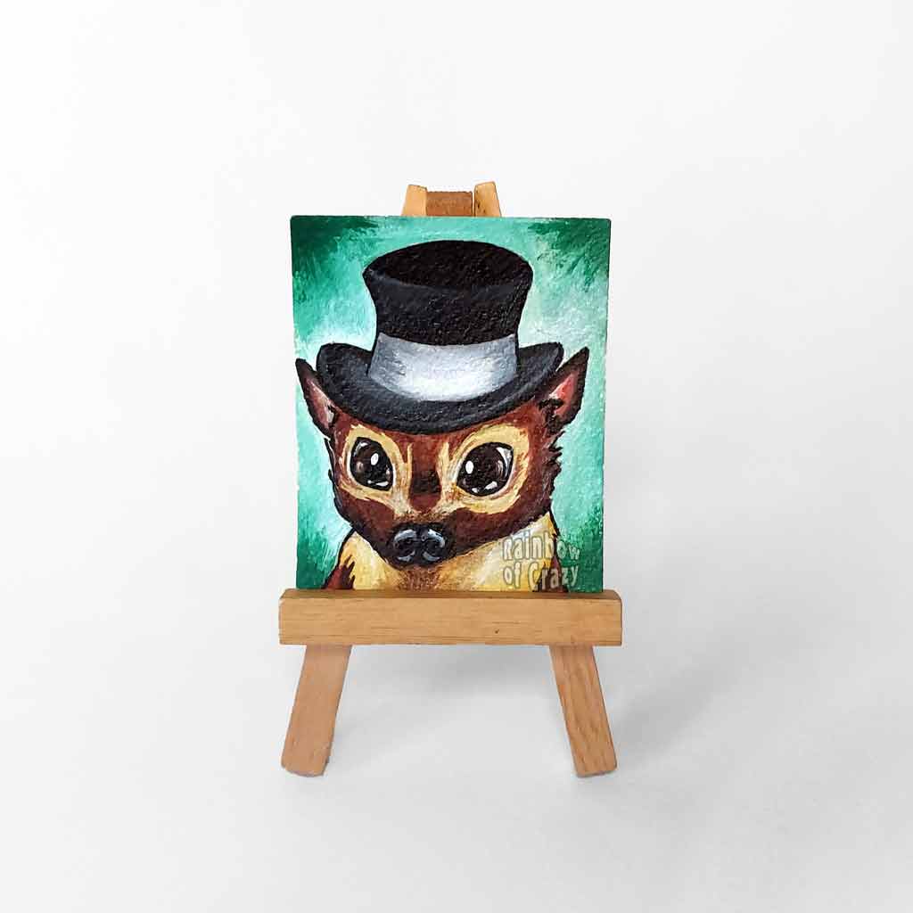 A little bat with a lot of class! This tiny hand painted artwork features a bat looking dapper in a top hat, all ready for an evening of mischief and adventure. This art makes a delightful gift for nature lovers and those that adore a bit of gothic flair