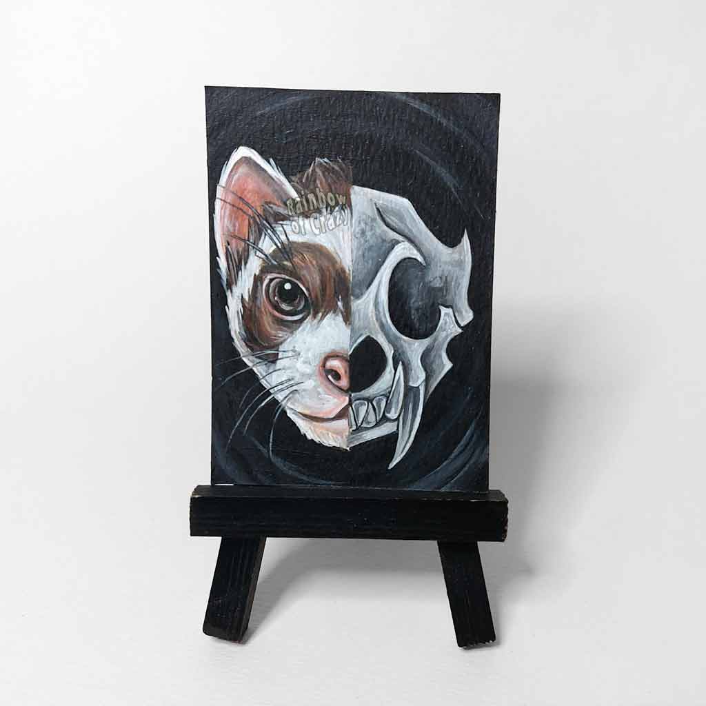 an aceo sized painting split into two sides. the left side shows half of a ferret's face. the right side shows an eerie ferret's skull. the painting sits on a tiny black easel