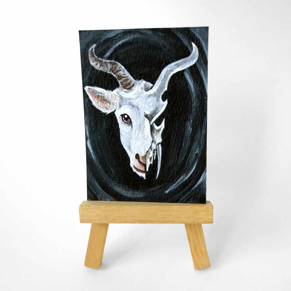 This original ACEO sized painting features a split image: a white horned goat's head on the left side, and a darker, stylized goat skull on the right. This mini work of art is perfect for that special goat owner with a little gothic flair!