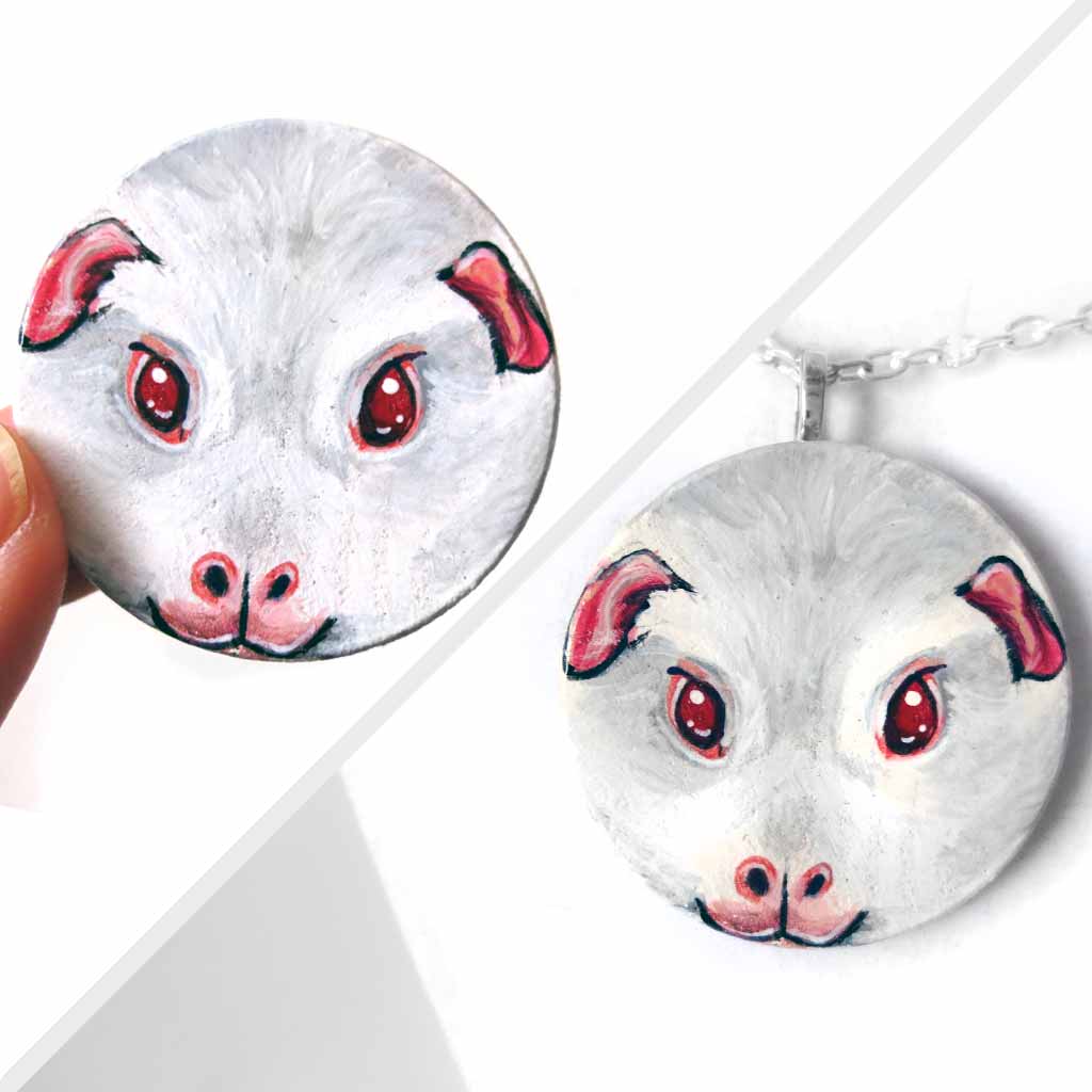 hand painted wood portrait of a white Guinea pig with red eyes, available as a keepsake or pendant necklace
