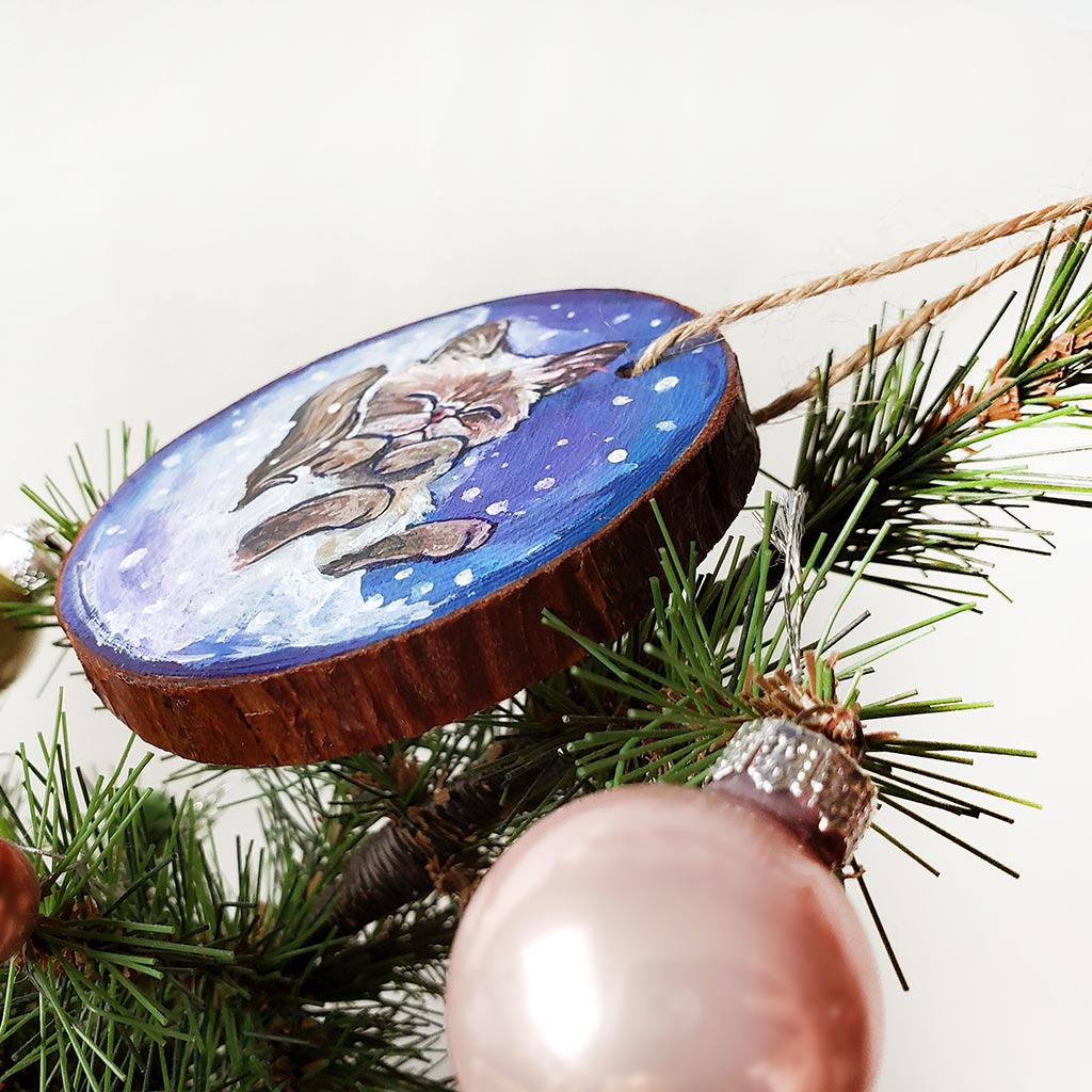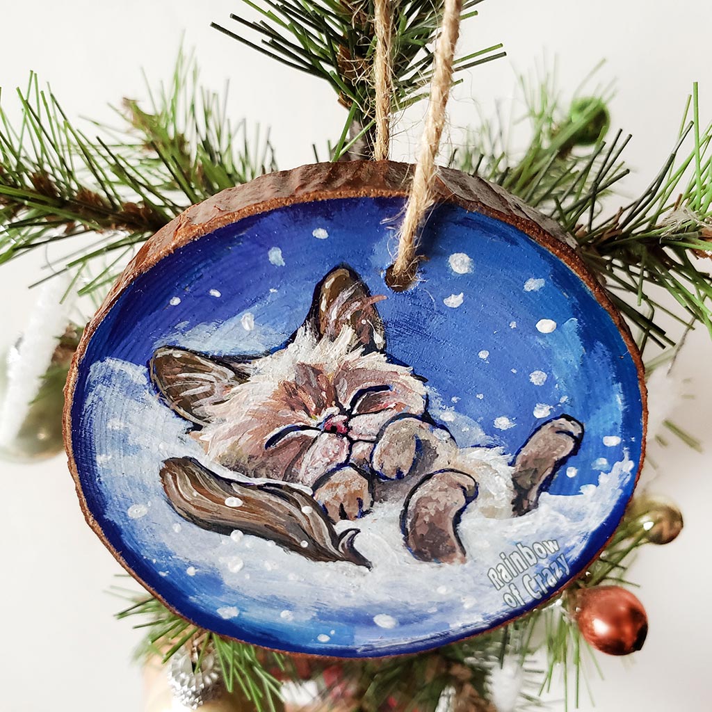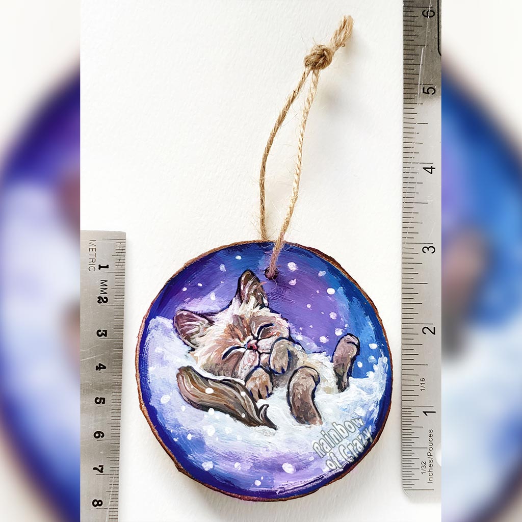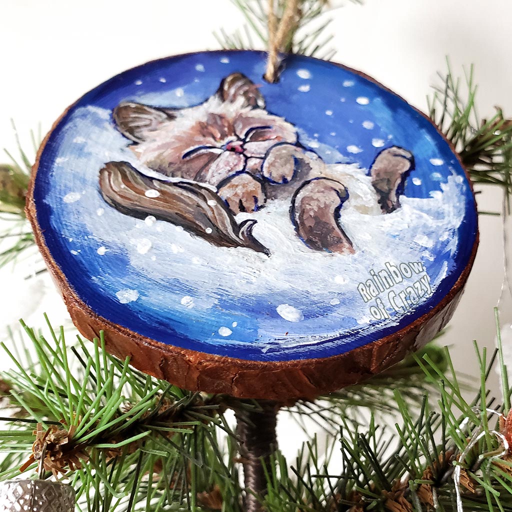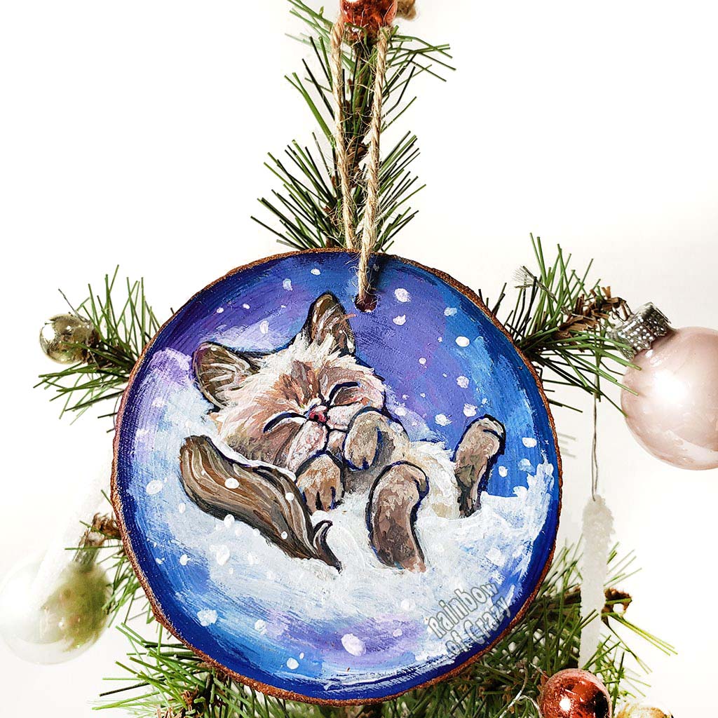 A Christmas tree wood ornament, hand painted with art of a Himalayan cat sleeping on snow.