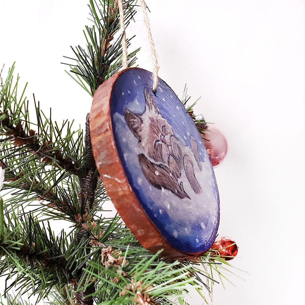 Perfect for any cat lover this Christmas! This beautiful wood ornament features art of a Himalayan cat. Hand painted, the cat is lying down on fluffy snow, having a lovely cat nap. The background includes soft blues with a hint of purple This piece makes a unique gift to give for the holidays!