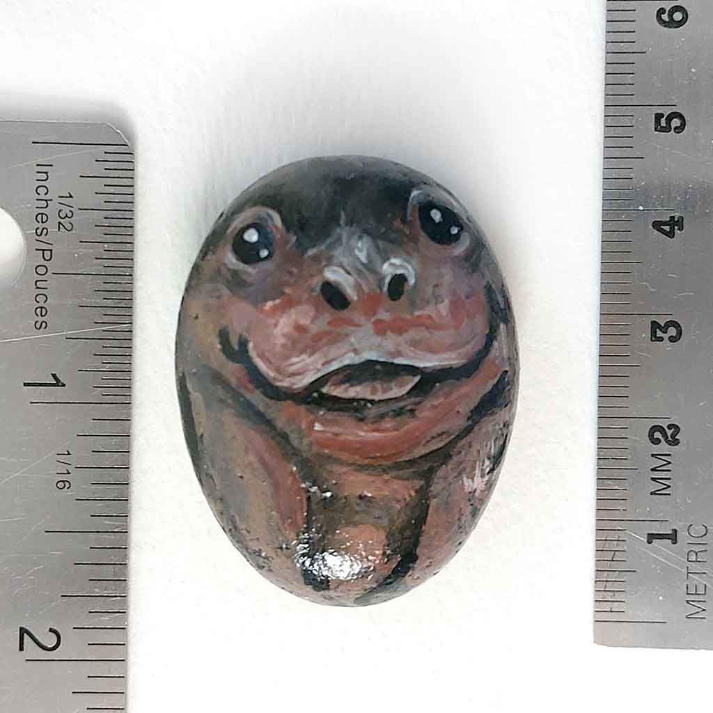 a small beach stone painted to looke like a smiling baby hippo. the underside features the hippo's bottom and is signed with, RainbowofCrazy