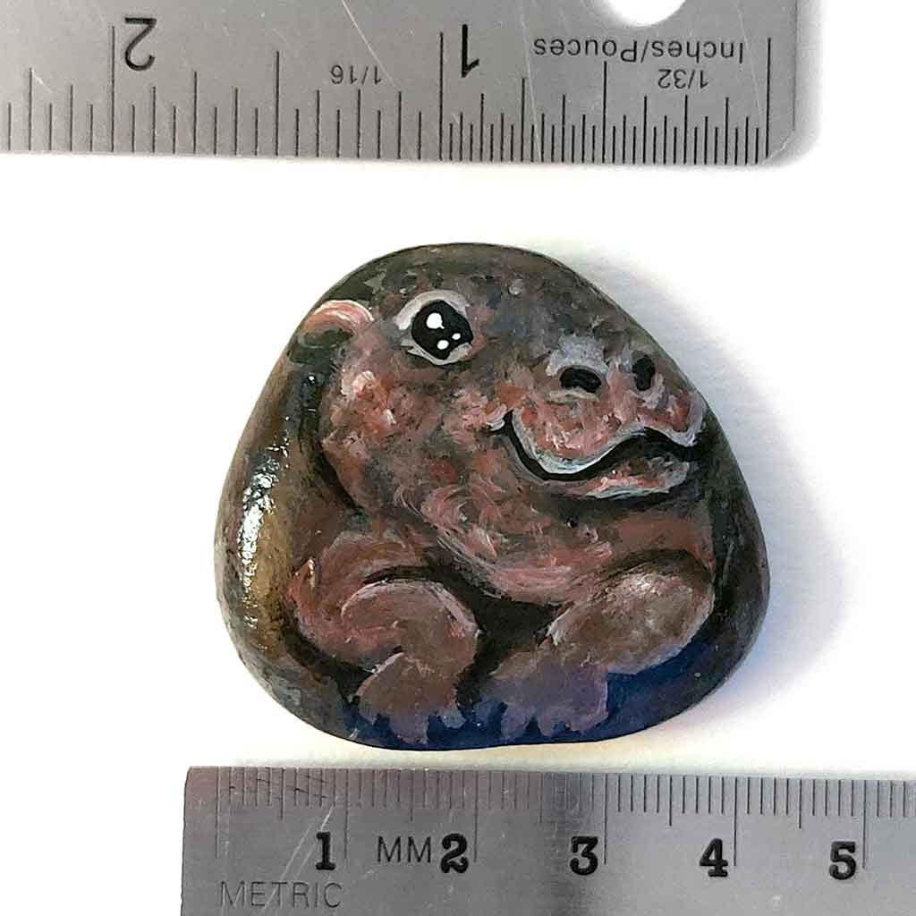 a smooth, flat, beach stone hand painted with a smiling hippo