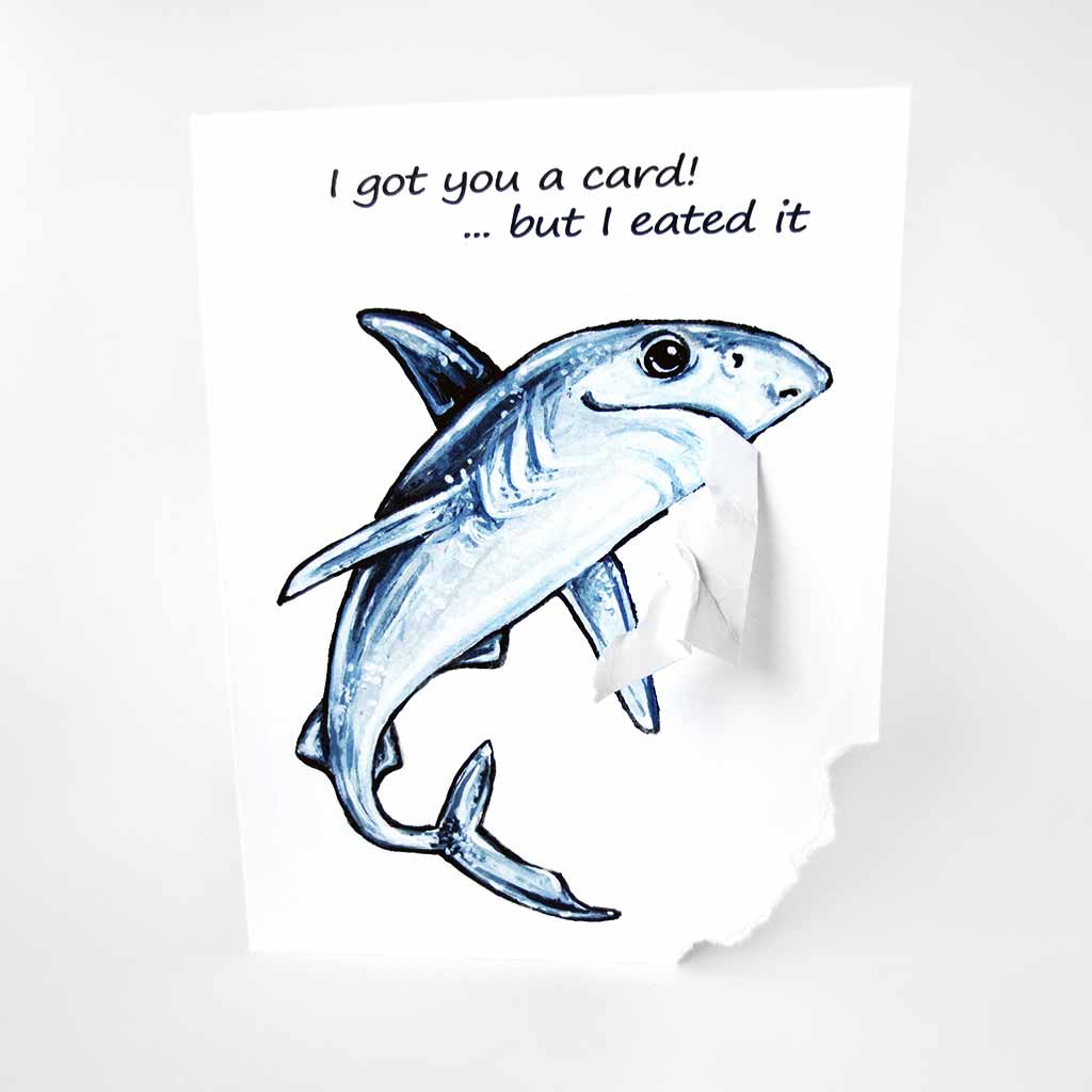a greeting card with art of a blue shark. text reads, "i got you a card! ... but i eated it". the bottom right corner of the card is ripped off and hangs from the shark's mouth.