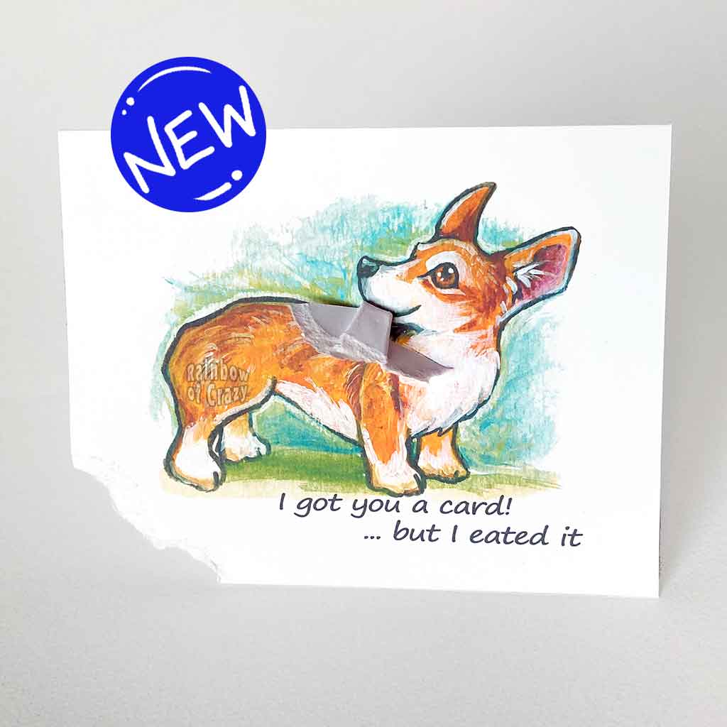 a greeting card with art of a corgi. The card reads, "I got you a card! ... but I eated it". the bottome left corner of the card is ripped and hangs from the dog's moutha greeting card featuring art of a corgi. The card reads, "I got you a card! ... but I eated it". the bottom left corner of the card is ripped and hangs from the dog's mouth