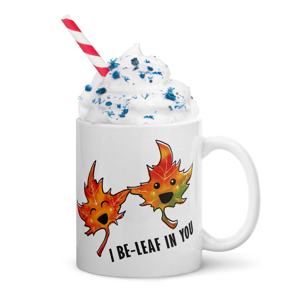A 15 oz white ceramic mug, printed with art of two maple leaves with happy faces, and the words. "I be-leaf in you"