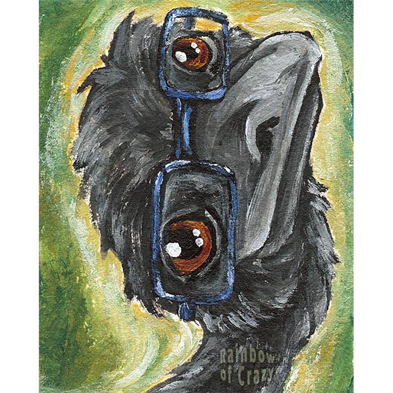 an art print featuring a painting of an emu's face wearing blue eyeglasses.