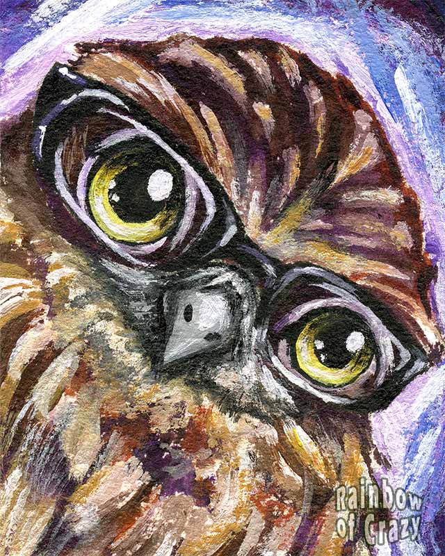 an art print featuring an illustration of a boobook owl, wearing black glasses