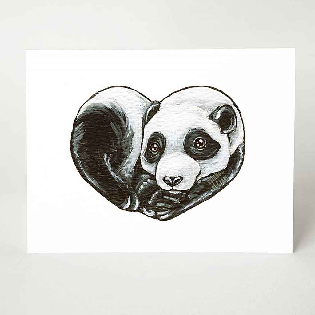 a greeting card featuring an illustration of a panda bear, curled up in the shape of a heart
