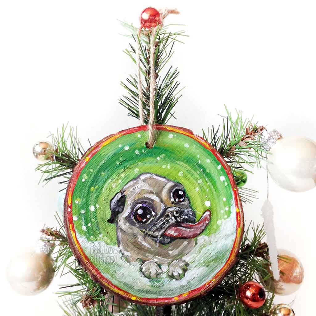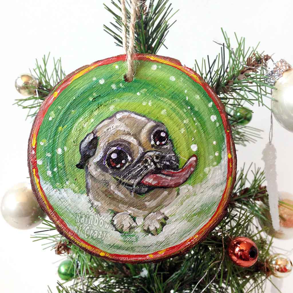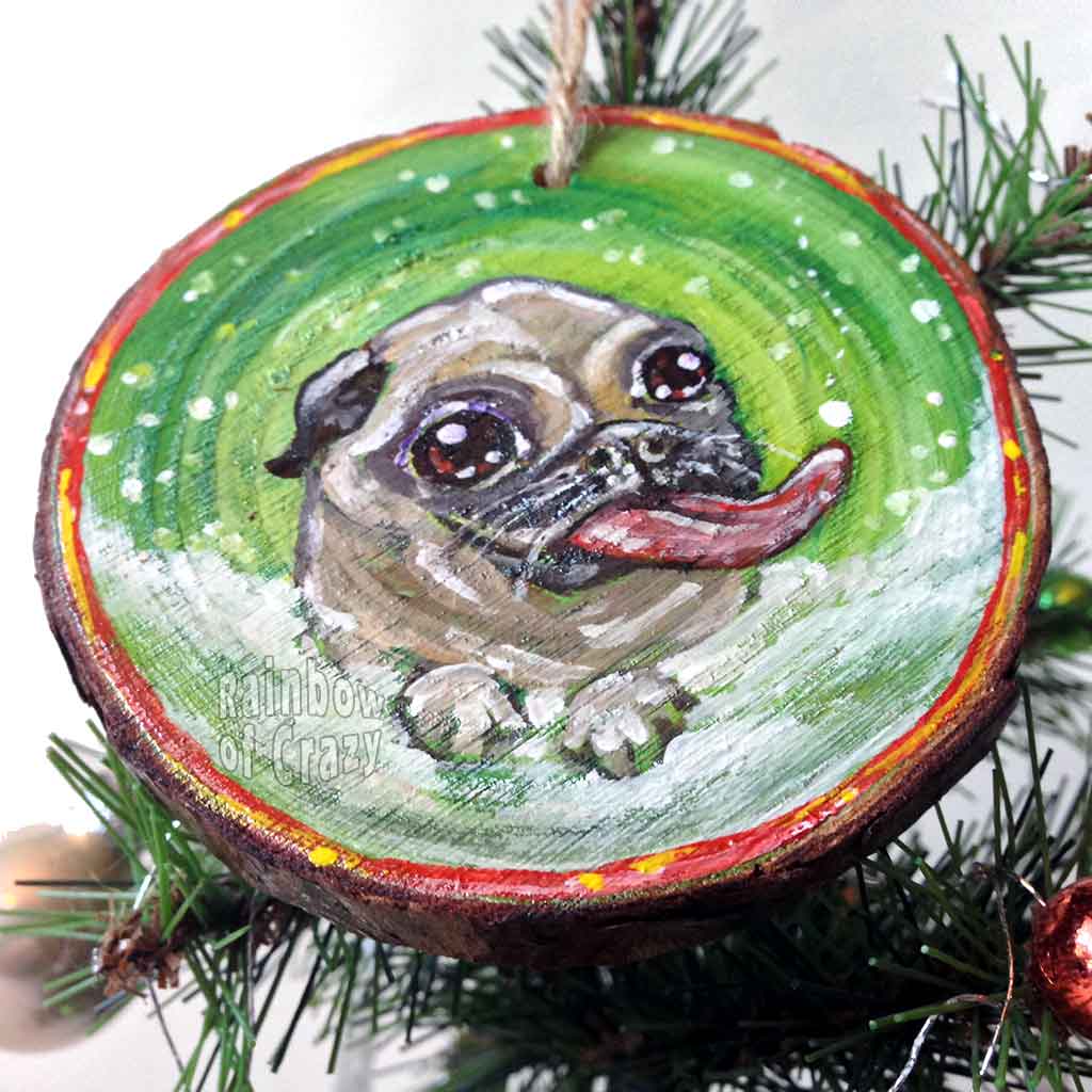 a wood ornament, hand painted with a pug in the snow, tongue out, ready to catch snowflakes. signed on the  back with, rainbowofcrazy