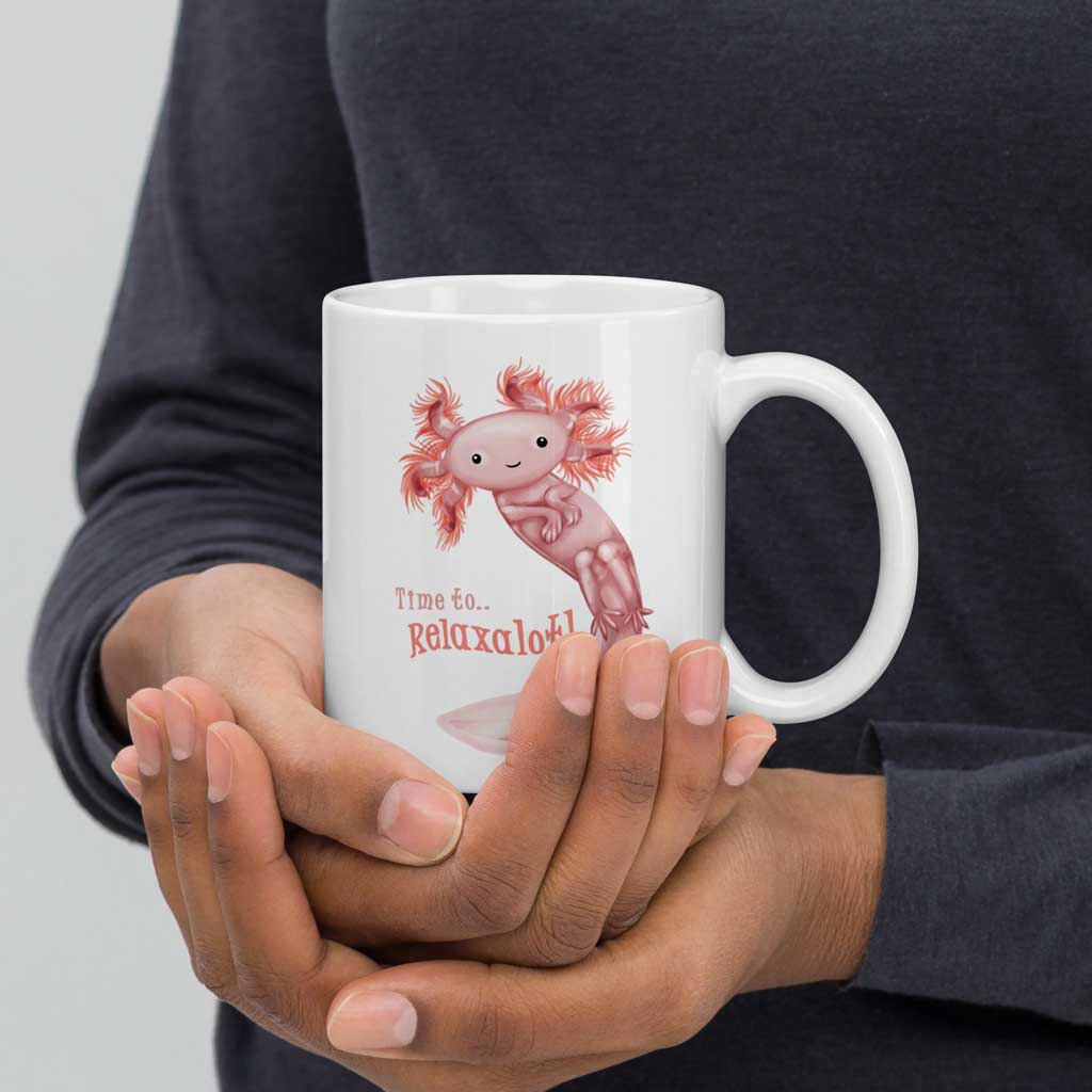 hands holding a white ceramic mug, 11 oz size, with an illustration of a smiling axolotl next to the text "Time to.. Relaxalotl"