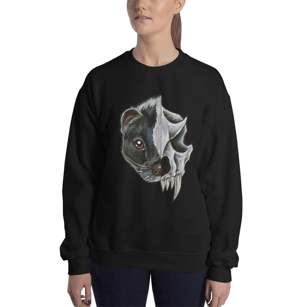 • Load image into Gallery viewer, A woman wears a unisex sweatshirt in the colour black, printed with an image of a split portrait: the left side features the face of a skunk, and the right side features an evil looking skunk skull
