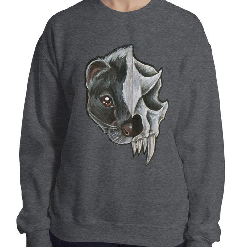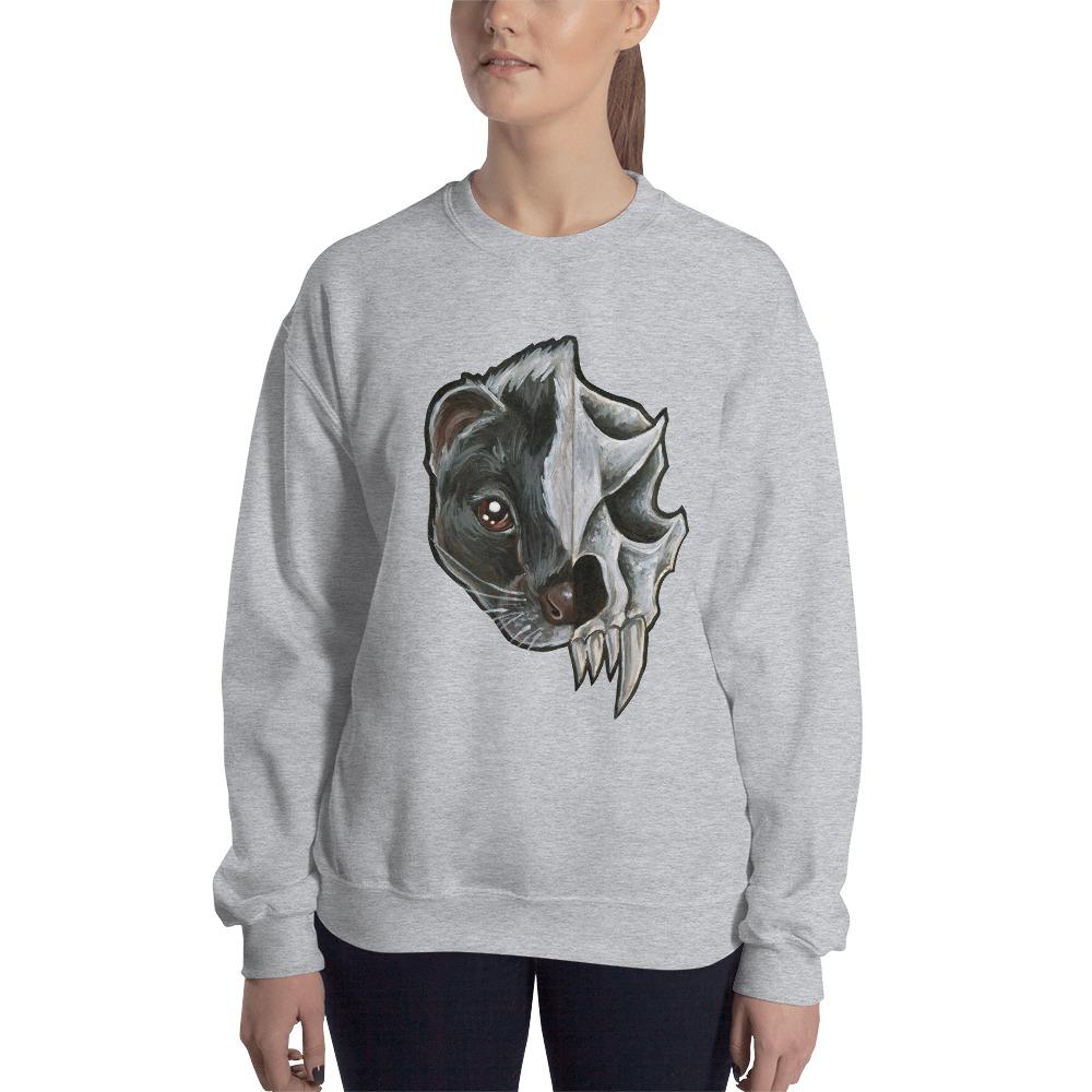 A woman wears a unisex sweatshirt in the colour sport grey, printed with an illustration of a split portrait: the left side features the face of a skunk, and the right side features an evil looking skunk skull