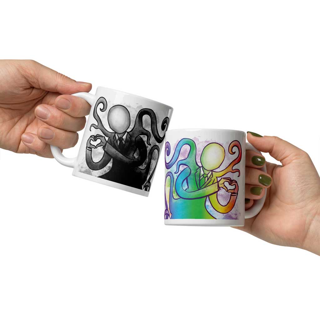 one hand holding a 11 oz white ceramic mug with an illustration of Slender Man forming a heart with his hands. a second hand is holding a second mug, showing it from the other side, featuring the same illustration, mirrored, in all the colours of the rainbow.