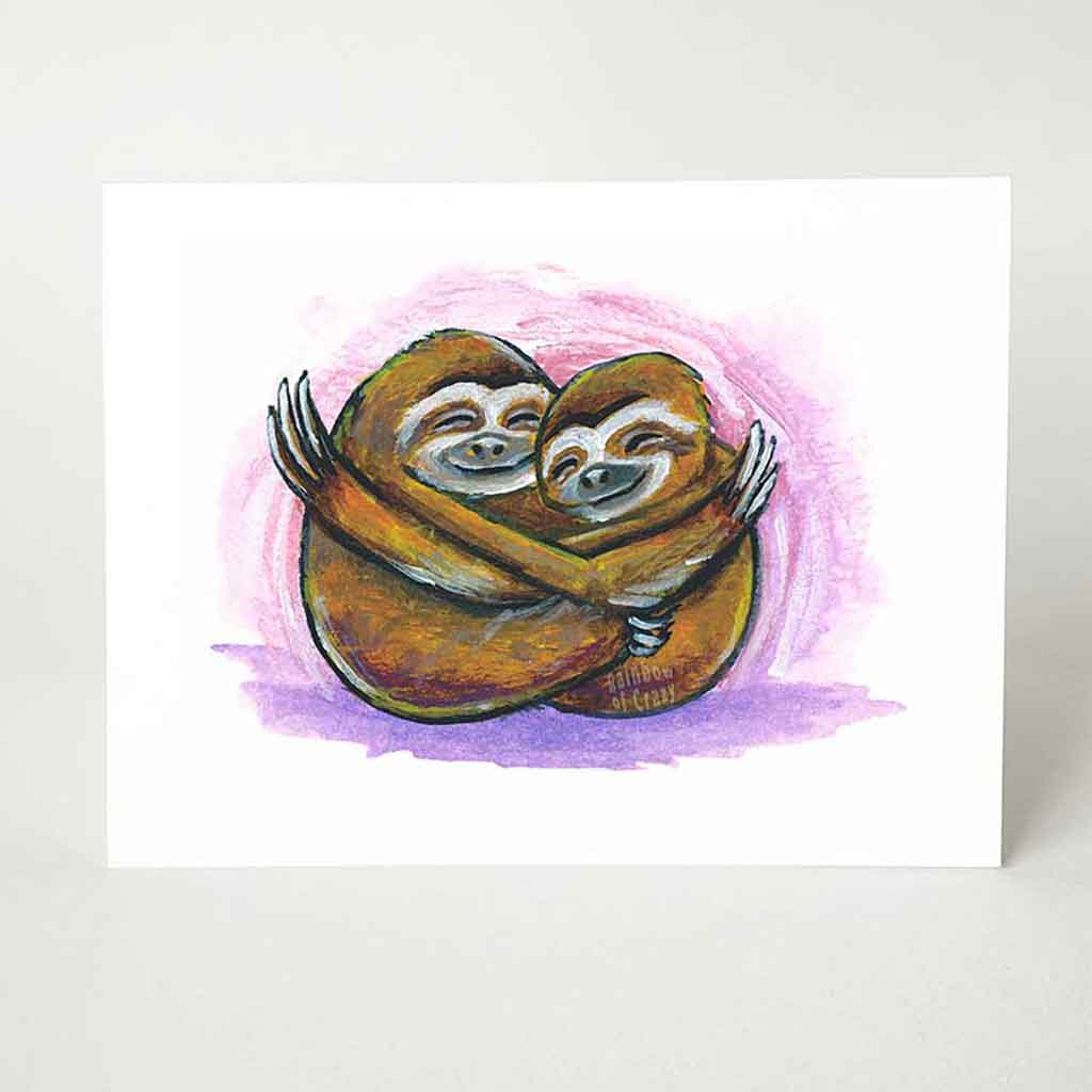 A greeting card with art of two sloths hugging, in front of a purple and pink background