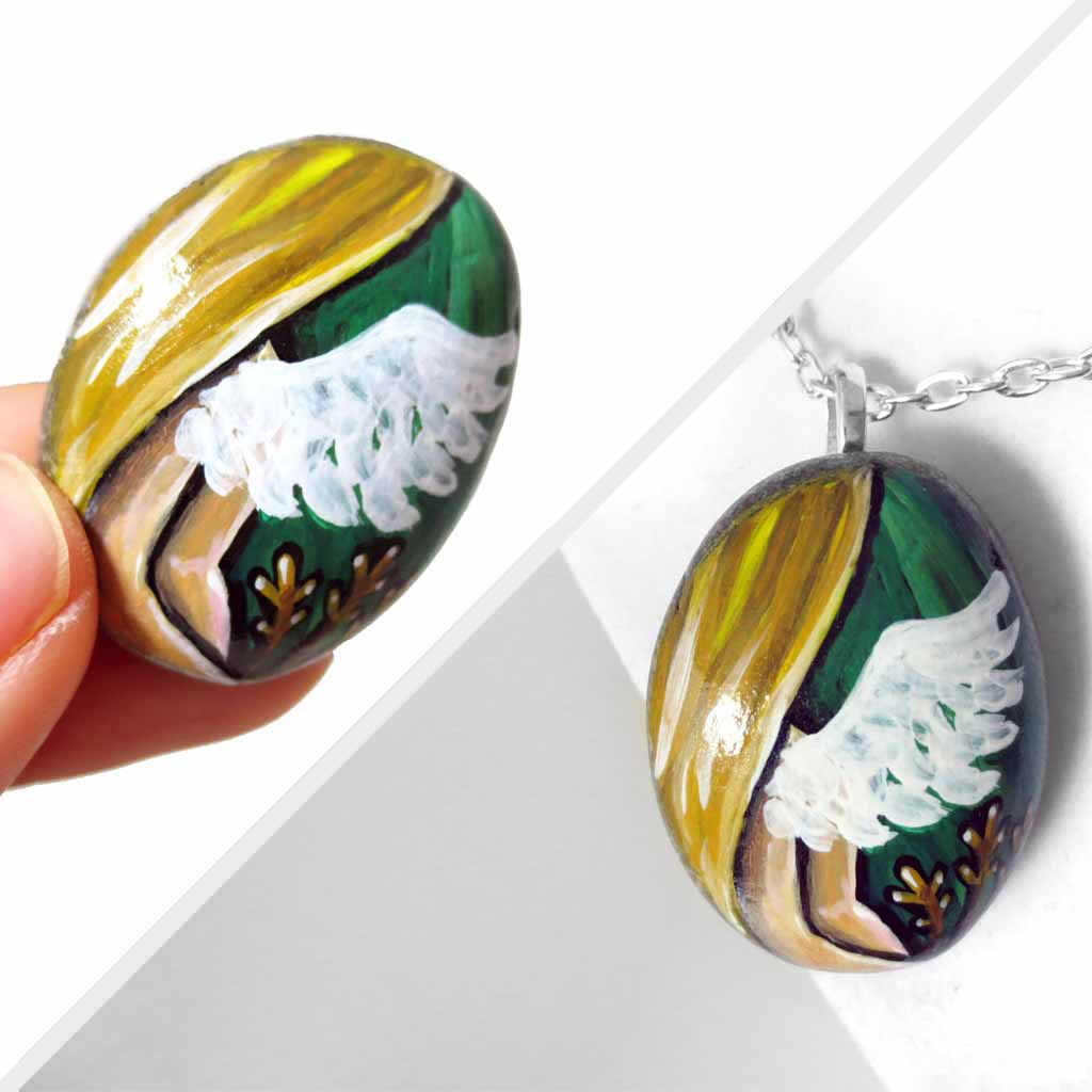 This beautiful rock art is inspired by the zodiac sign Virgo, the virgin, and is available as a keepsake, fridge magnet, or pendant necklace. Hand painted on natural beach stone, it features a woman's back, with long, blonde hair and angel wings rising up. To her side are three sheaves of wheat. The green hues symbolize Virgo's element of earth.