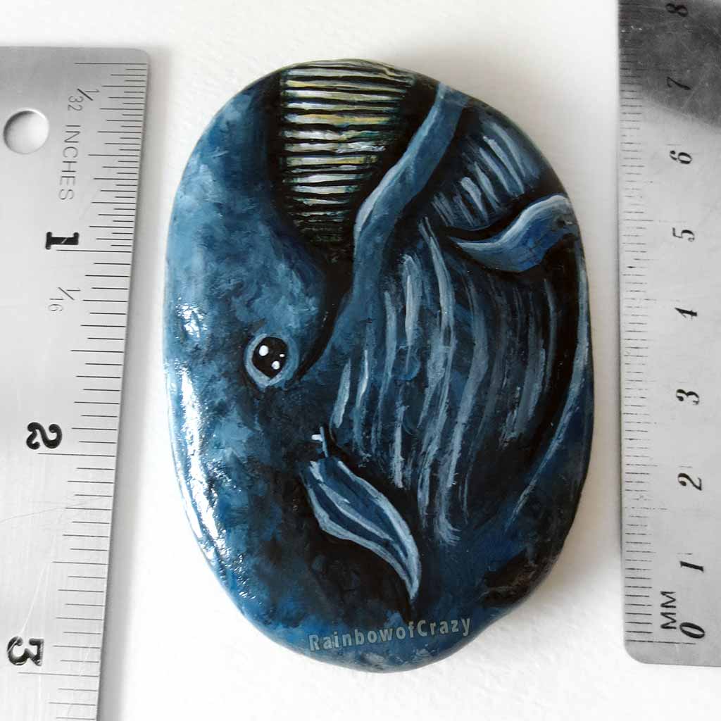 rock art portrait of a smiling blue whale, signed on the edge with, rainbowofcrazy