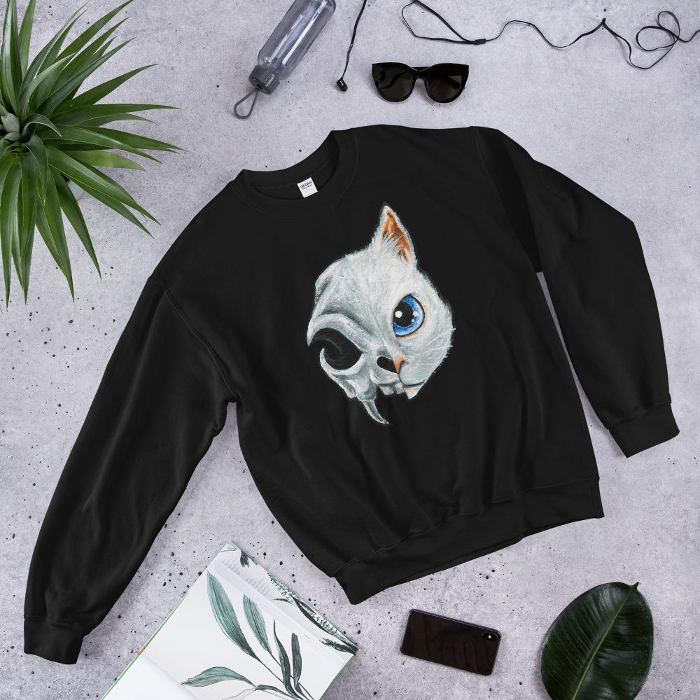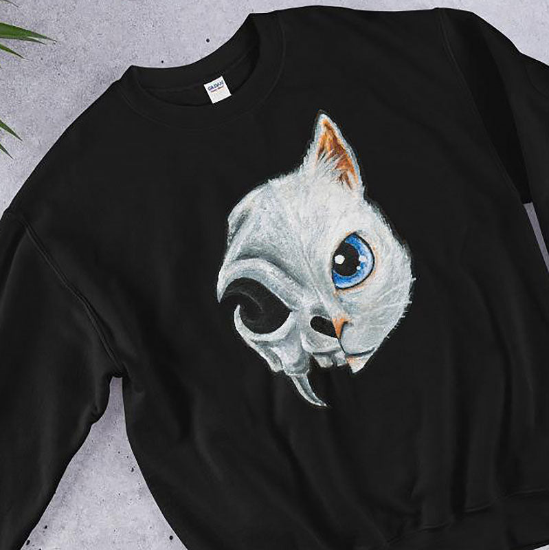 A unisex sweatshirt in the colour black, printed with art split into two: the right side features the face of a blue eyed white cat, and the left side features an evil looking cat skull.