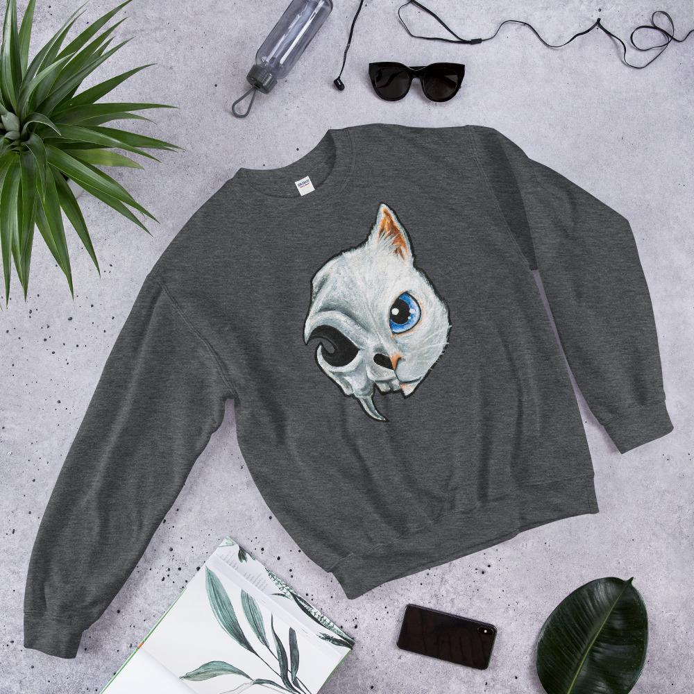 A unisex sweatshirt in the colour dark heather grey, printed with a graphic split into two: the right side features the face of a blue eyed white cat, and the left side features an evil looking cat skull.