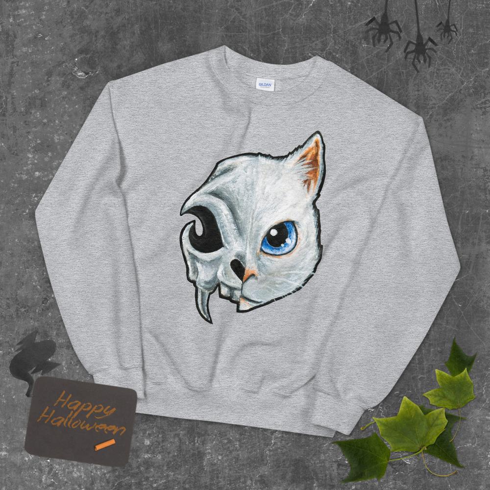 A unisex sweatshirt in the colour sport grey, printed with an illustration split into two: the right side features the face of a blue eyed white cat, and the left side features an evil looking cat skull.