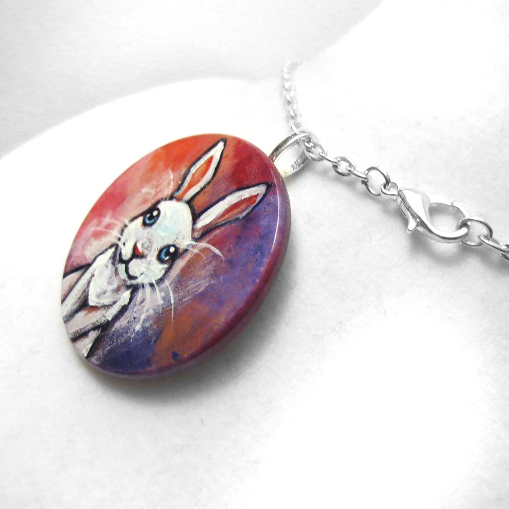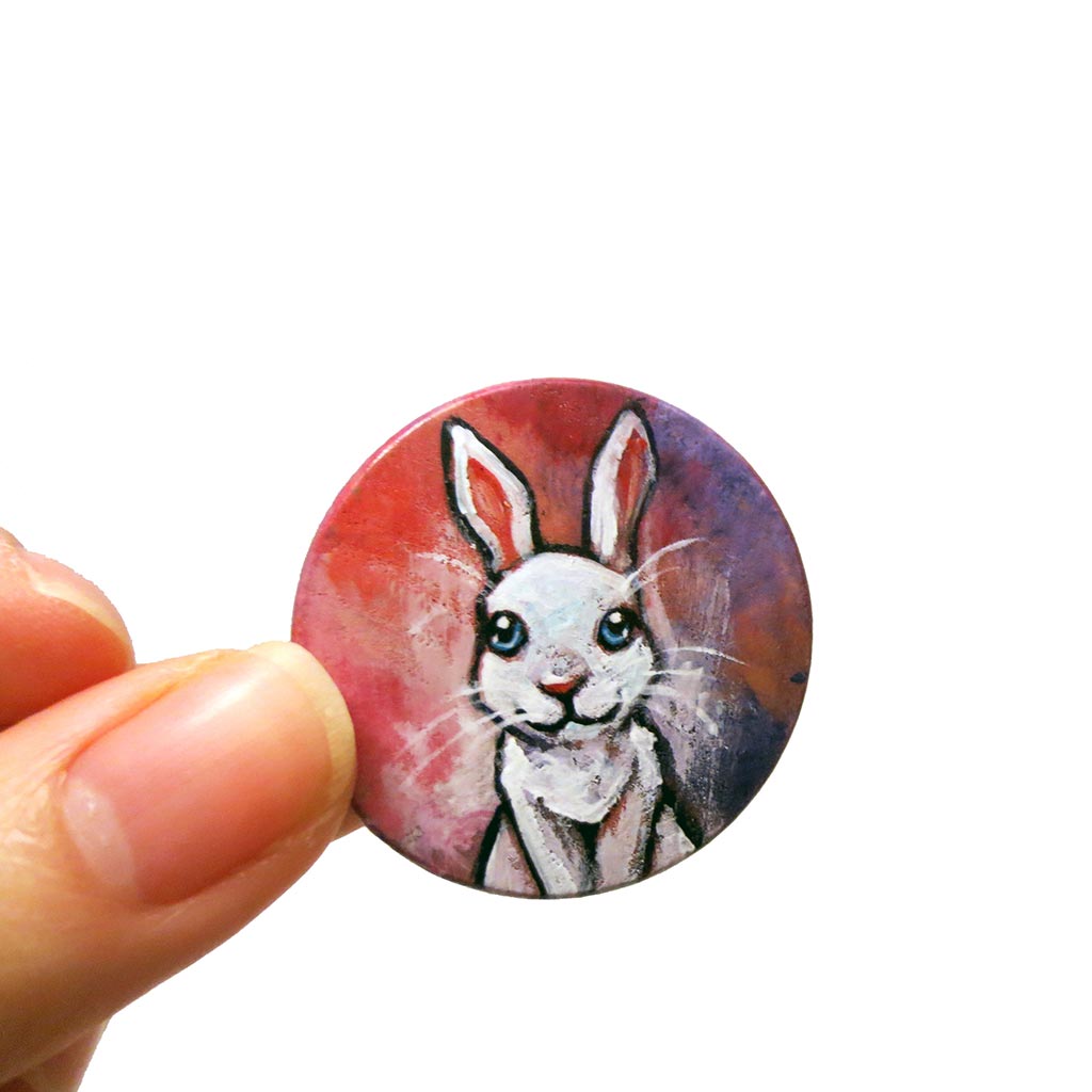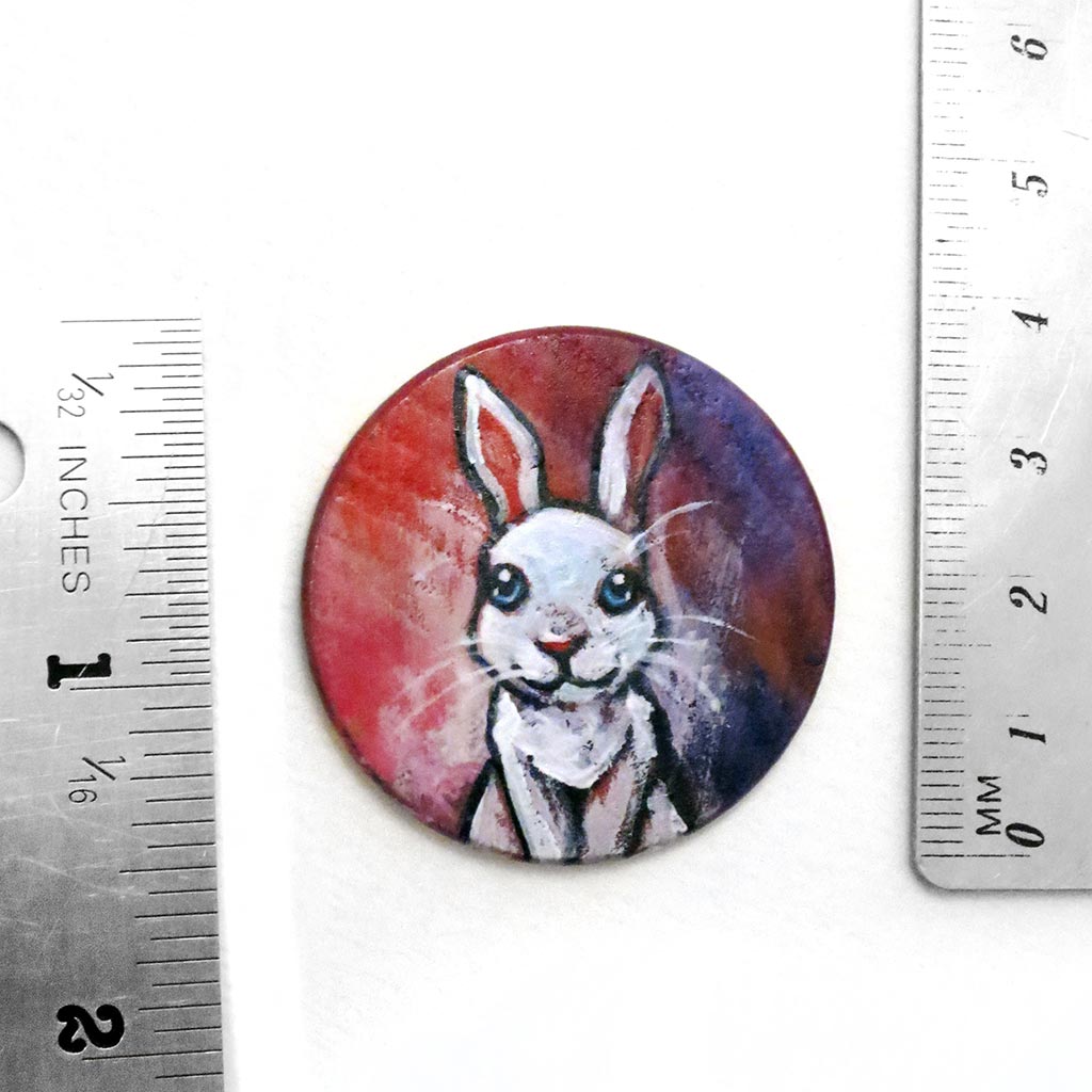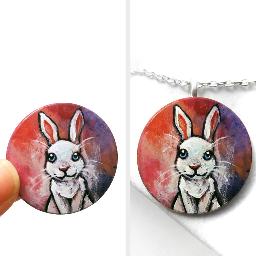 This super cute rabbit art is available as a keepsake, fridge magnet, or a pendant necklace! It features a white rabbit with baby blue eyes. Painted on a wood circle, this art makes a beautiful pet portrait gift. It also makes a lovely memorial gift for those that have experienced pet loss.