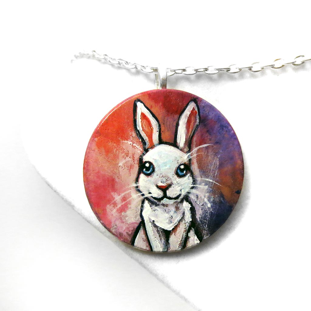 A circle wood disc painted with art of a white rabbit with blue eyes, available as a keepsake or necklace
