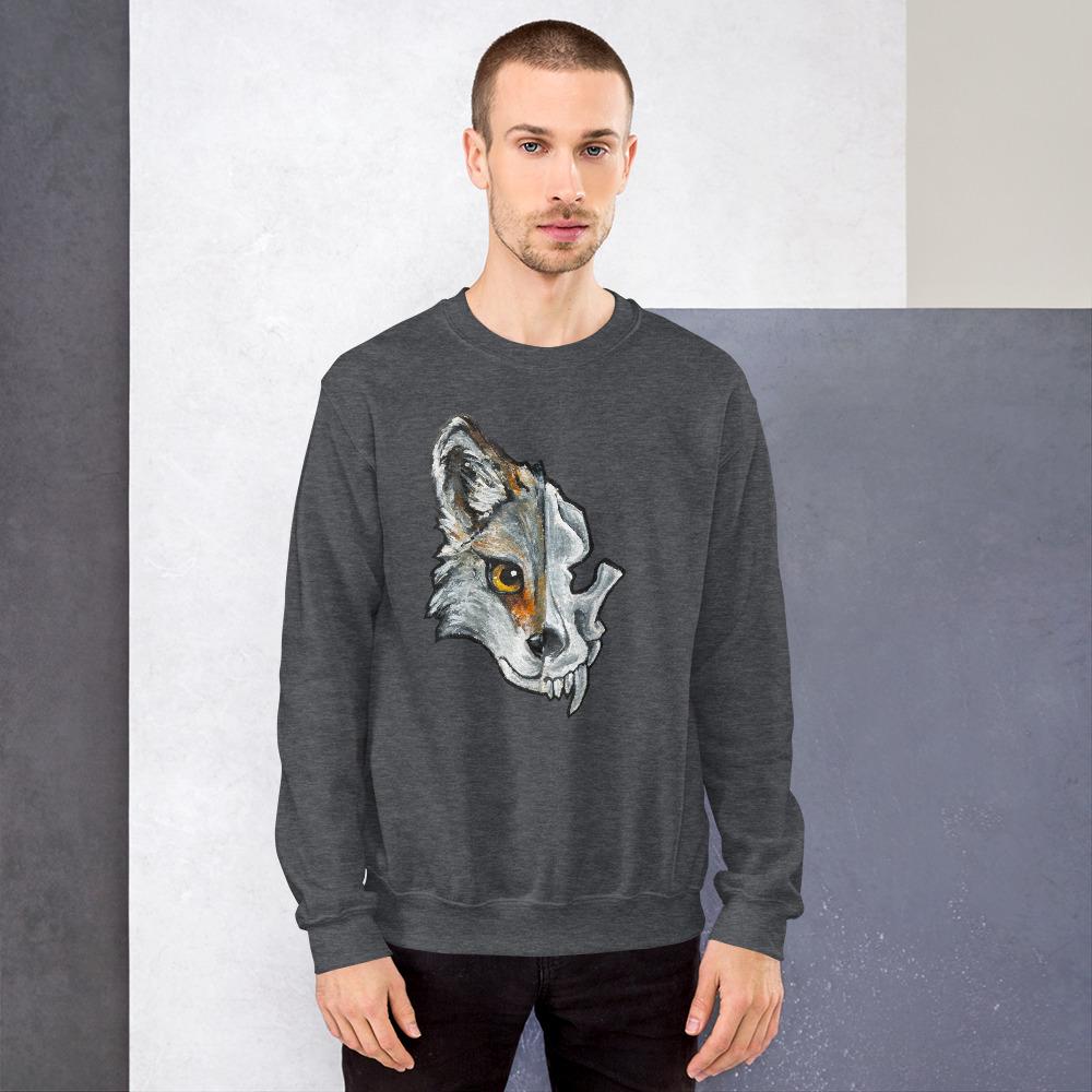 A man wears a unisex sweatshirt in the colour dark heather grey, printed with artwork of a split image: the left side features a wolf's face, and the right side features an evil looking wolf skull.