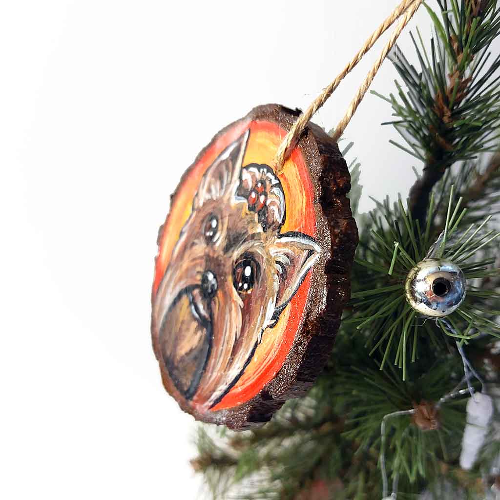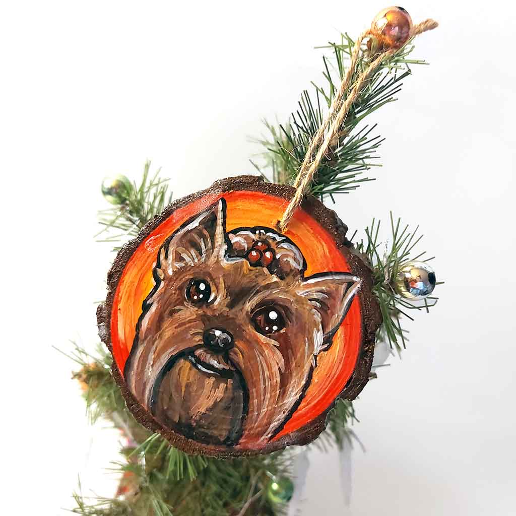 A beautiful hand painted wood ornament, perfect for that special Yorkie owner! This ornament features an adorable Yorshire Terrier's face, painted against a red and orange background. This unique tree ornament will make any animal lover smile.